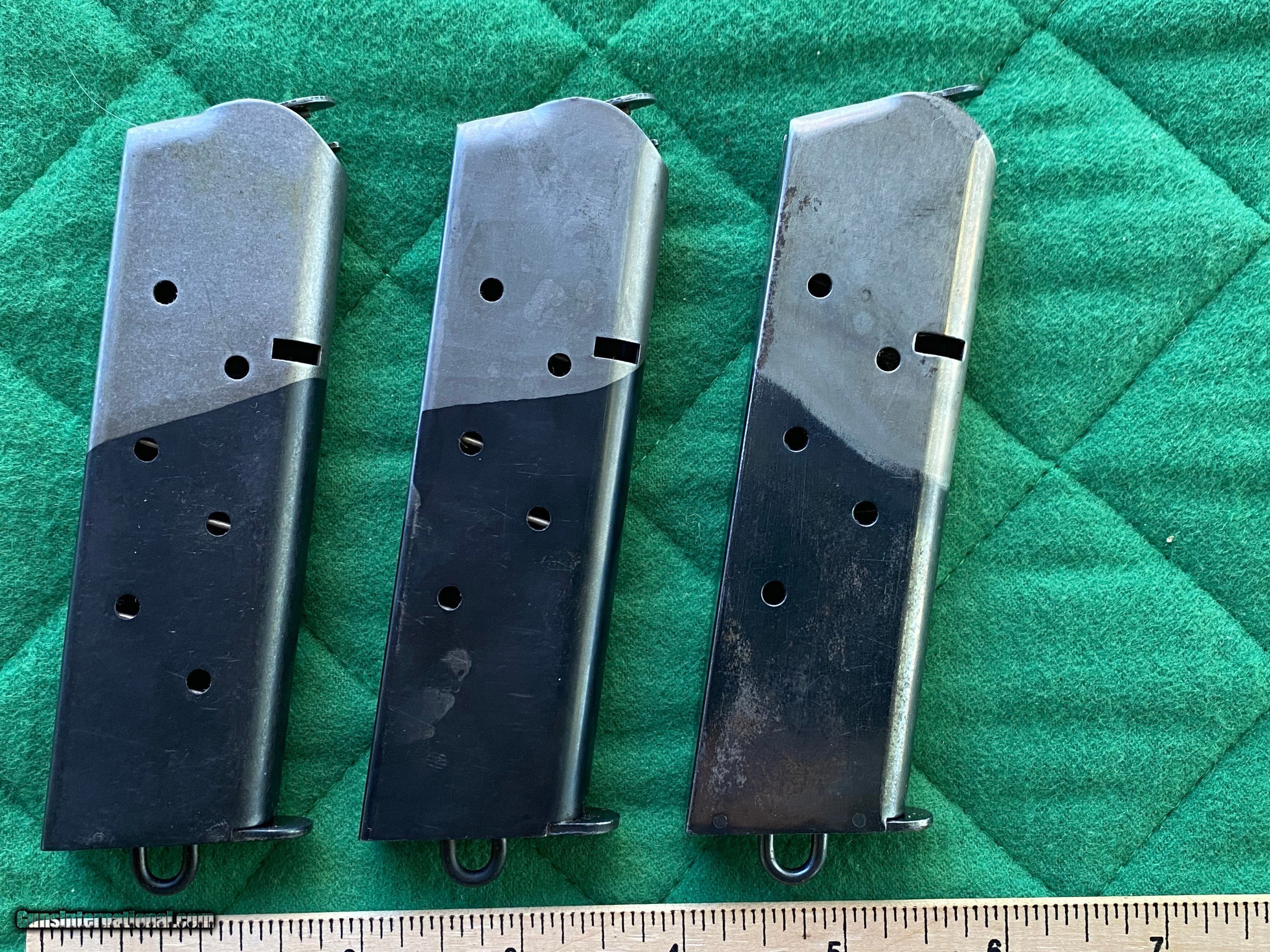 Description: An esteemed 1911 expert has confirmed these are high quality copies of original early WWI era Type III 1911 magazines. Likely created in the late 20th century from original U.S.G.I. or Norwegian stock, they have the look and feel of the genuine article. All are 7-round capacity and are unmarked. Mechanically fine. Some light oxidation marks and edge wear. Offered at a a fraction of the price of the genuine article. Add $10 S/H Check or M.O. Please SOLD Handgun Caliber: .45 ACP (.45 Auto) |