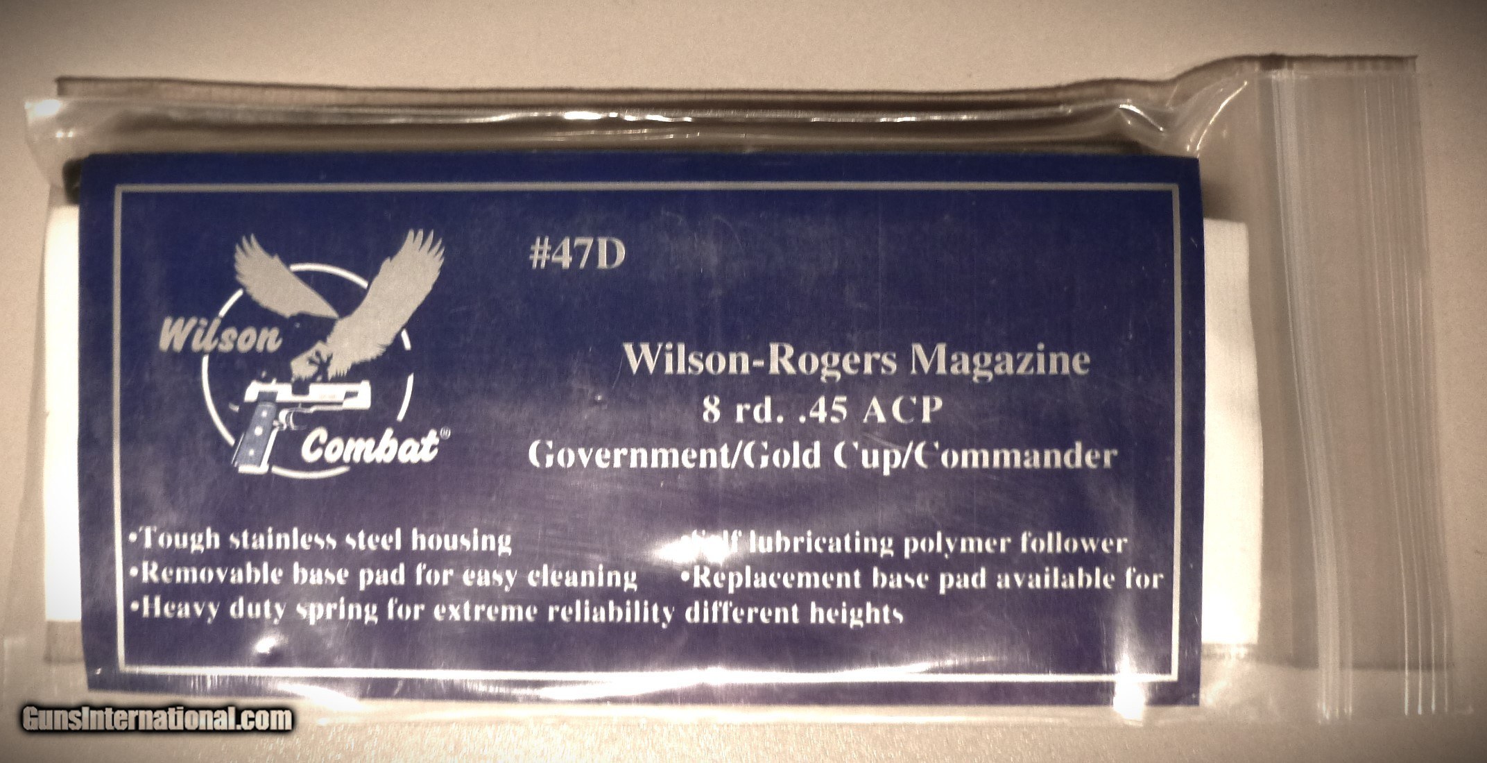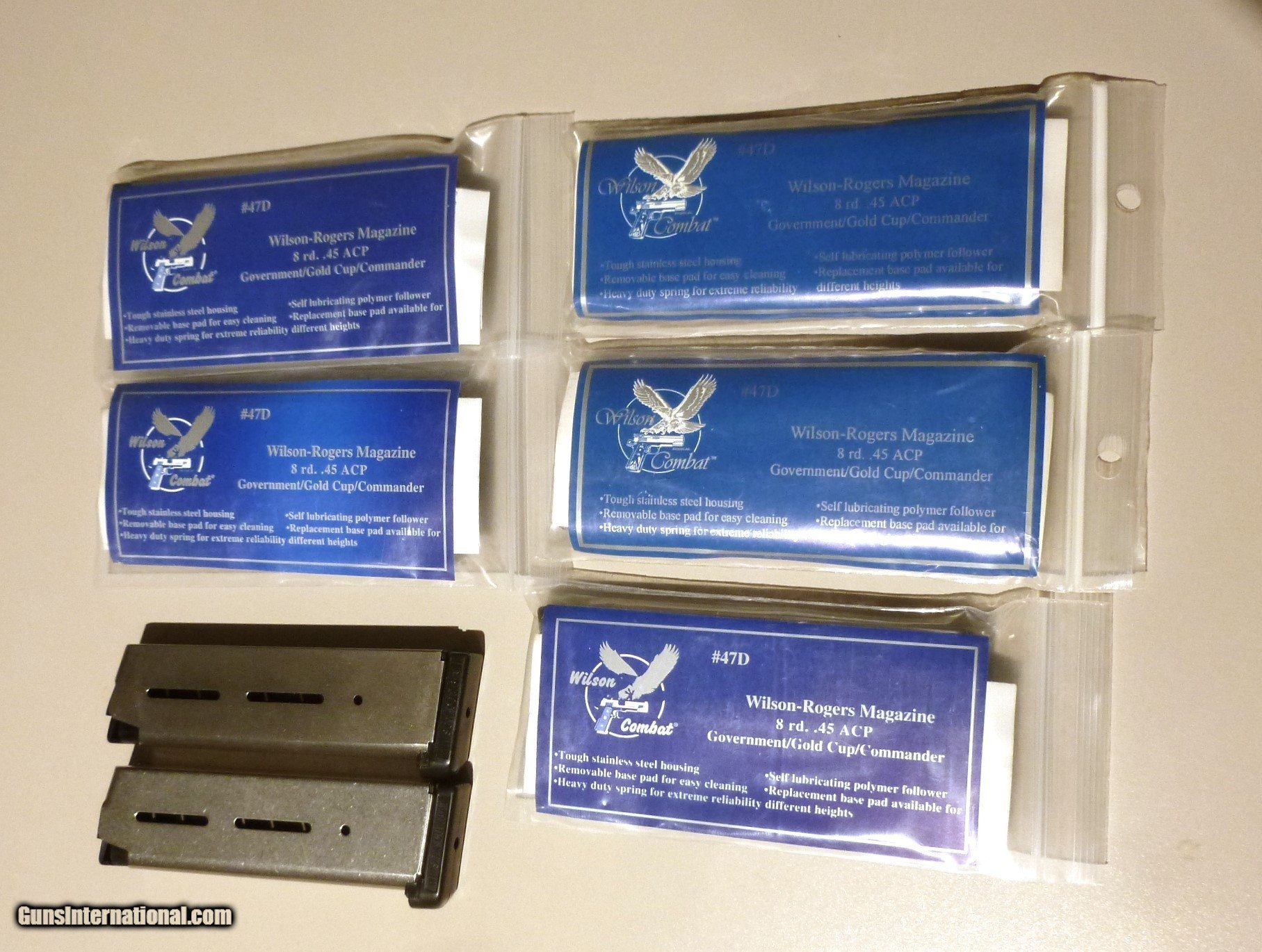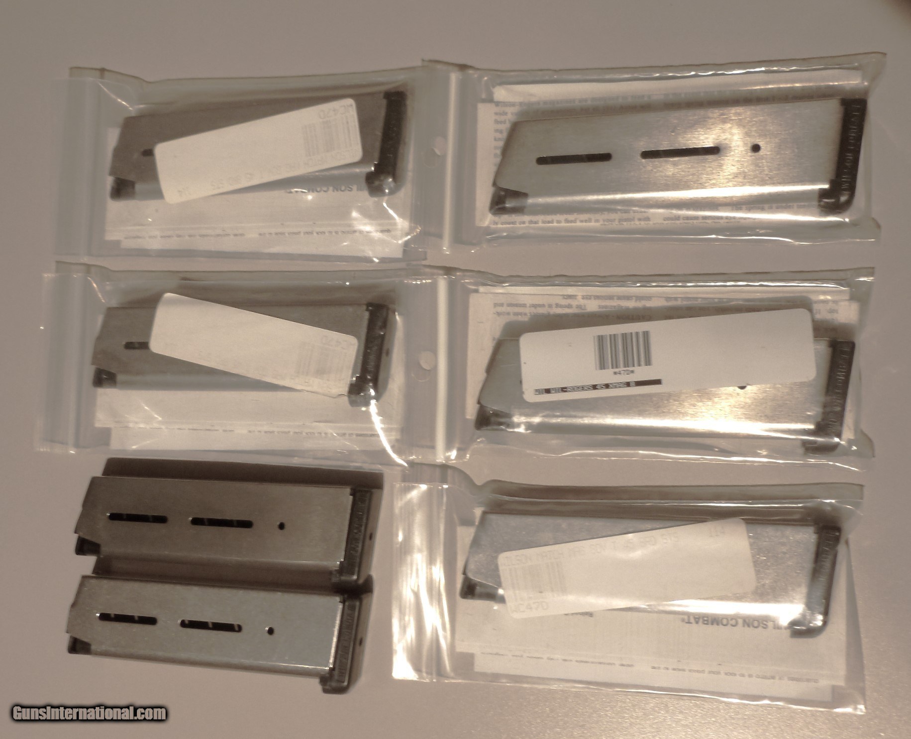 Description: Offered for sale, seven (7), brand new, never used Wilson Combat #47D 8 round .45 ACP magazines. Stainless steel housing. Five are in original packaging and two are without original packaging. Sold as a lot of 7,. Not sold individually. Buyer pays $12.00 shipping and handling. Payment by cashier's check or USPS money order only. USA shipments/transactions only. SOLD |
