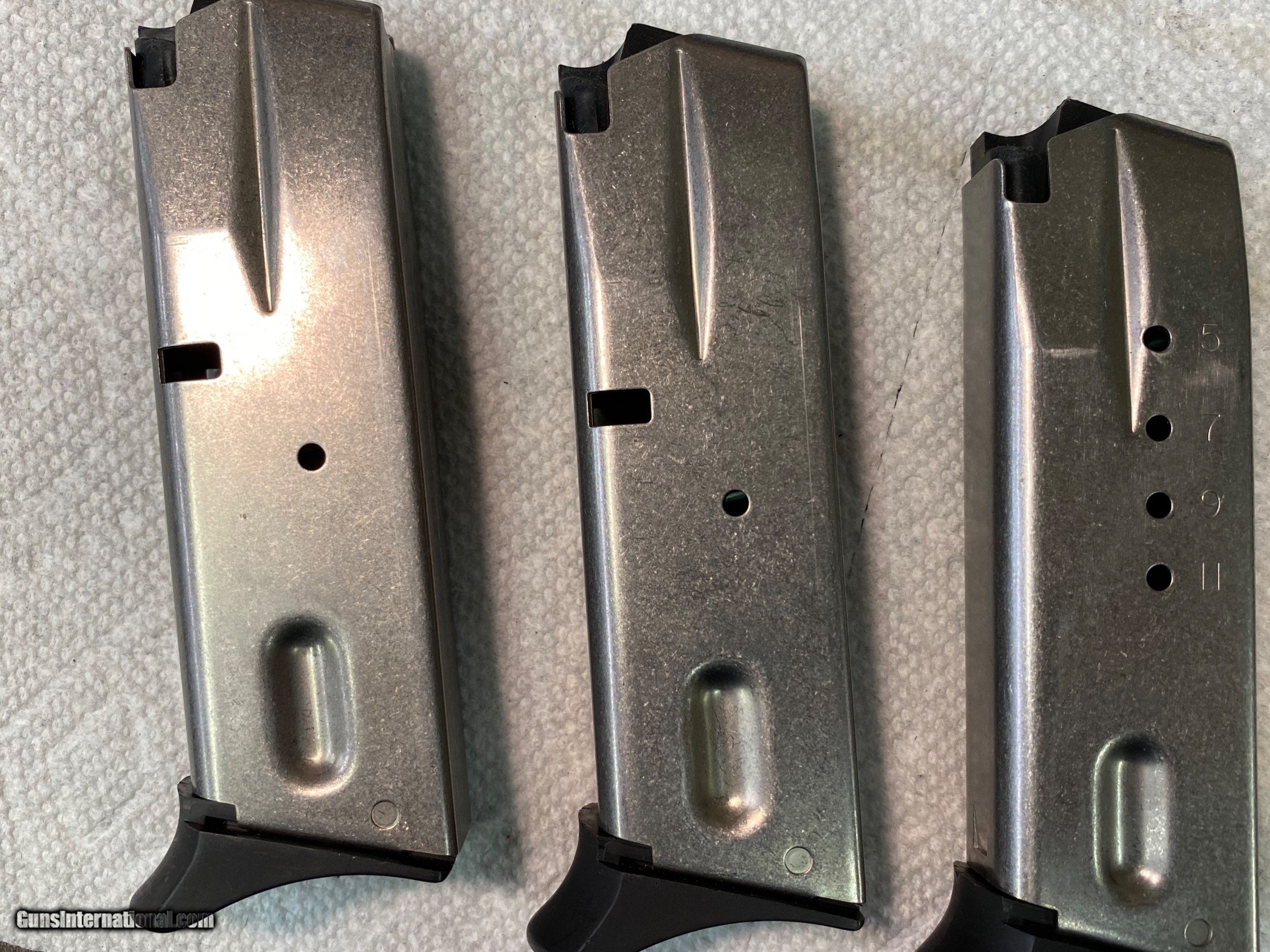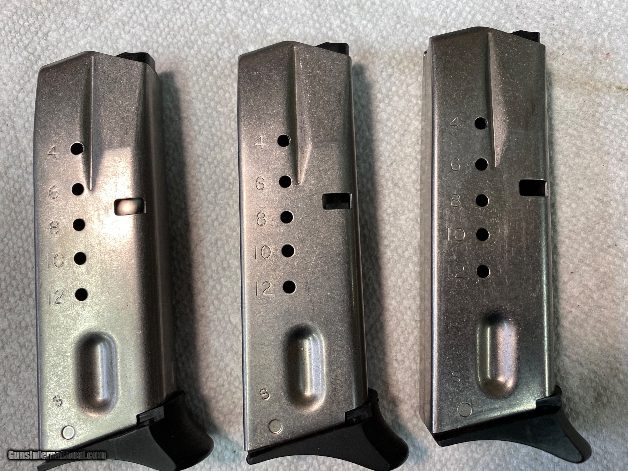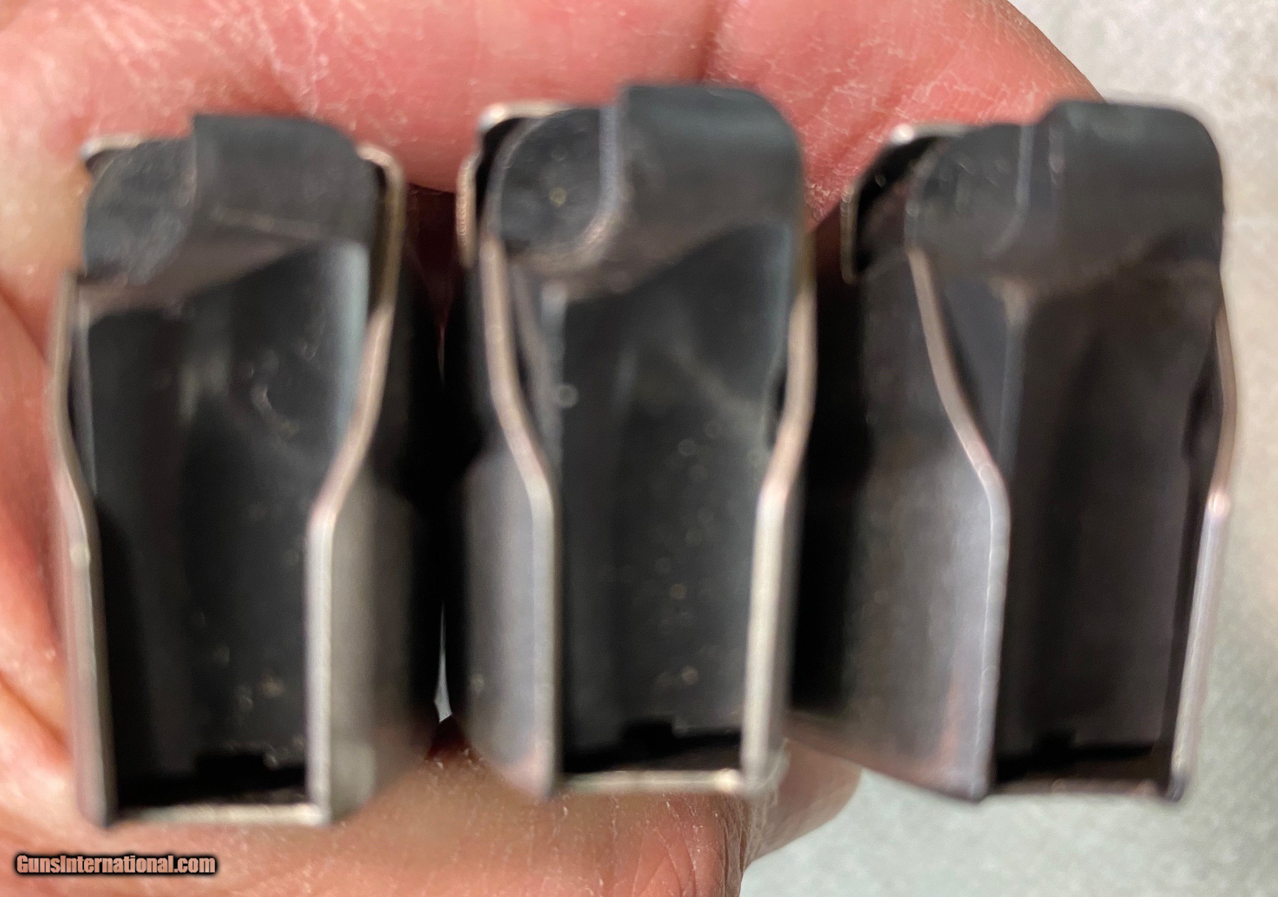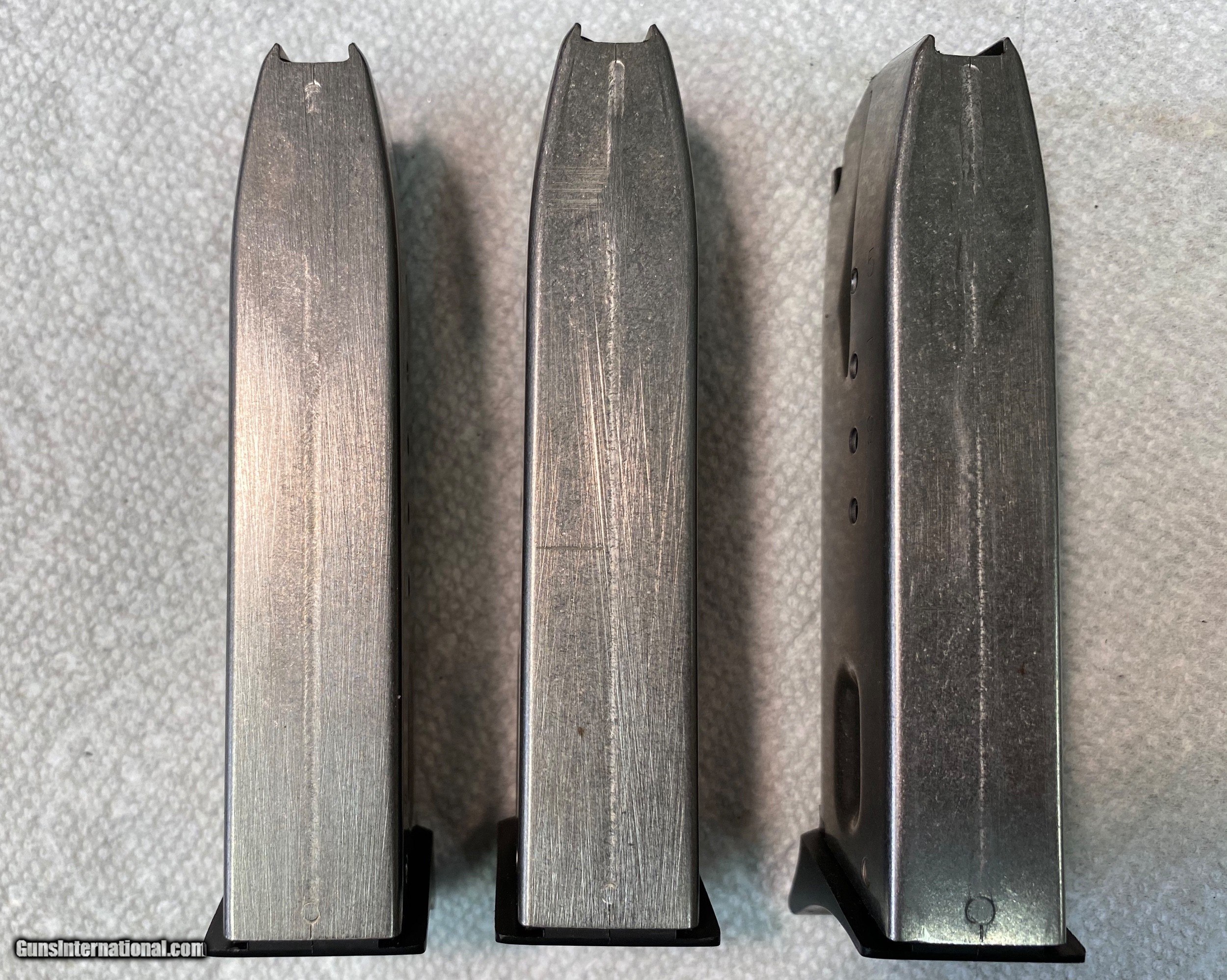 Description: Do you have an older Smith & Wesson Model 469 and need magazines for it? Well, you just found some, and at a good price too. Here we are offering three mags to fit your 469, and all are in VG/EXC shape. These are 12 round magazines, therefore, no sales to states which restrict magazines that have over a 10 round capacity. We reserve the right to sell these items at our retail location until an offer is placed on Guns International. These are silver in color and have a small finger rest on the floor plate. Please see pictures for more details on these magazines. USPS money order is the preferred method of payment. We do take major credit cards with a 4% surcharge. Please give us up to three business days to respond to emails and phone messages. Occasionally, we get quite busy with walk in traffic and/or paperwork. Thank you for your patience and understanding in this matter. We are open Tuesday through Saturday, 9 AM to 5 PM. Closed Sunday and Monday. Please take a look at our other ads on Guns International. You might find something that interests you. SOLD |