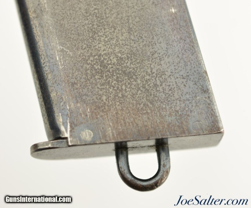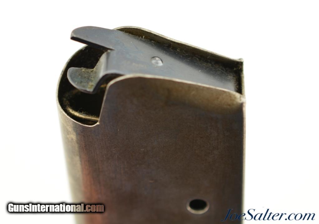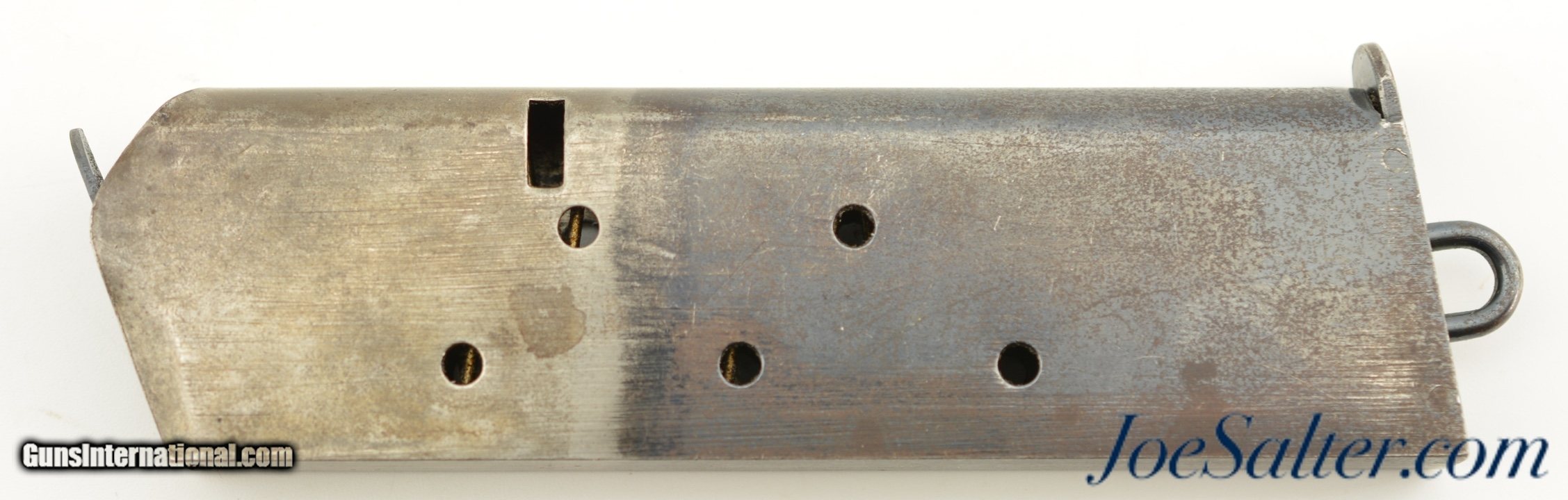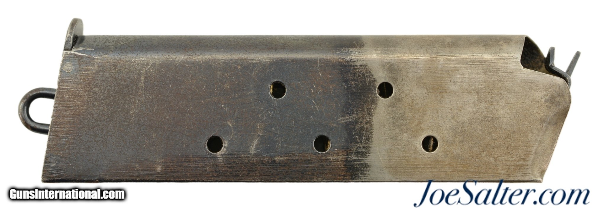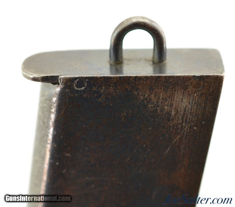 Description: This is an early unmarked Remington .45 Colt 1911 magazines with two-tone, a lanyard loop and two toe pins. This magazine is in excellent condition with very light surface oxidation, nice bluing line and firm spring. This magazine exhibits the noticeably shorter lip on the floor plate. SOLD |
