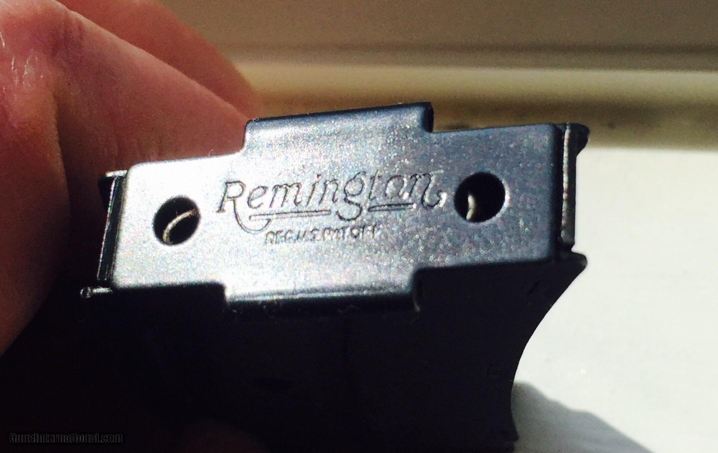 Description: Four - 5 shot factory Remington 22 caliber vintage and excellent condition 3 are stamped "Remington" and one is not $125.00 for the Remington labeled magazines $85.00 for the unmarked magazine SOLD |