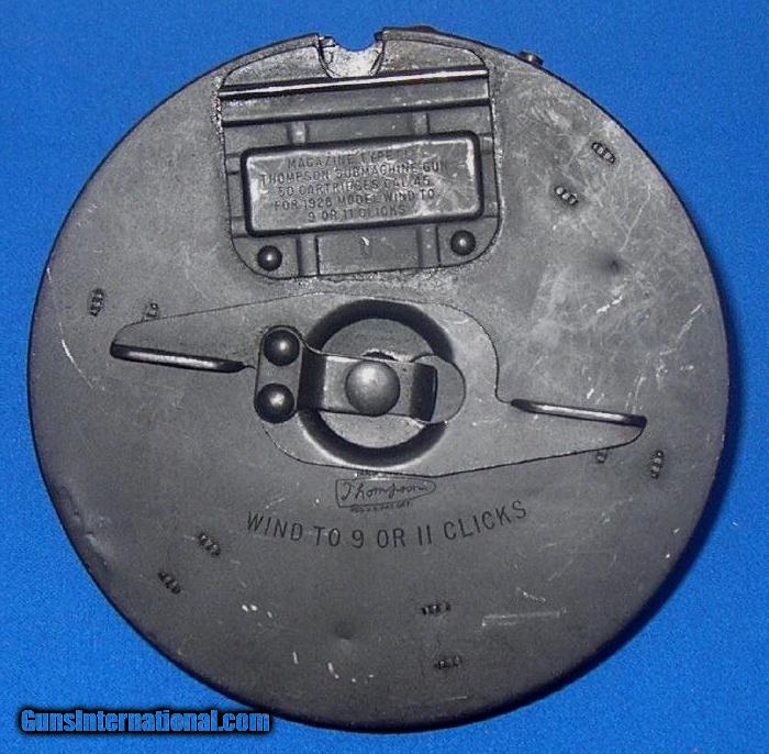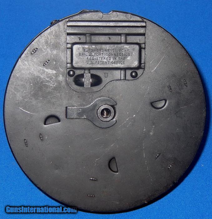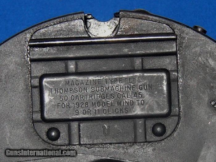 Description: * * * SOLD ON HOLD PENDING FUNDS / Thompson SMG 50 Rnd. “L” Drum, manufactured marked “U” (United Specialties Company), used drum in very good plus condition. Inv.: US 2345 SOLD |