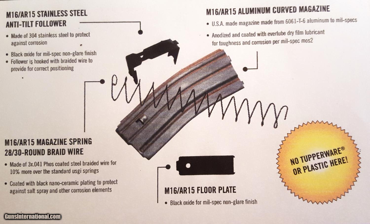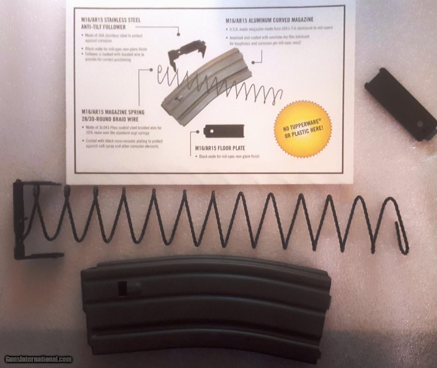 Description: For sale AR- 15 magazines superior OEM build quality designed with special engineered high- tech NO- MEMORY SPRINGS. Load magazine and forget it till needed! *304 SS anti-tilt followers *BRAIDED 28/30wire for superior strength *6061-T-aluminum material for magazine that's MIL-SPEC *Coated with nano-ceramic plating for optimum corrosion against element *USA made in OHIO by experienced tool and sheet fabricators with years of experience *NO PLASTIC components ALL METAL *Finished and anodized with everlube dry lubricant Built and designed for law enforcement and military contract 25 pcs 24.99 ea 50pcs-$21.99ea 100pcs-$19.99ea 500ea-$17.99 1000ea-$15.99 shipping 25.00 per CASE NO SALES TO CA,NY,CT AND WHERE PROHIBITIVE- KNOW YOUR LAWS. SOLD |