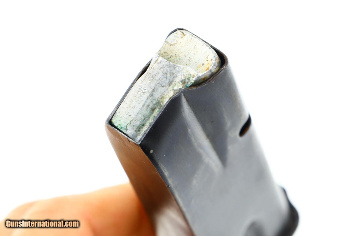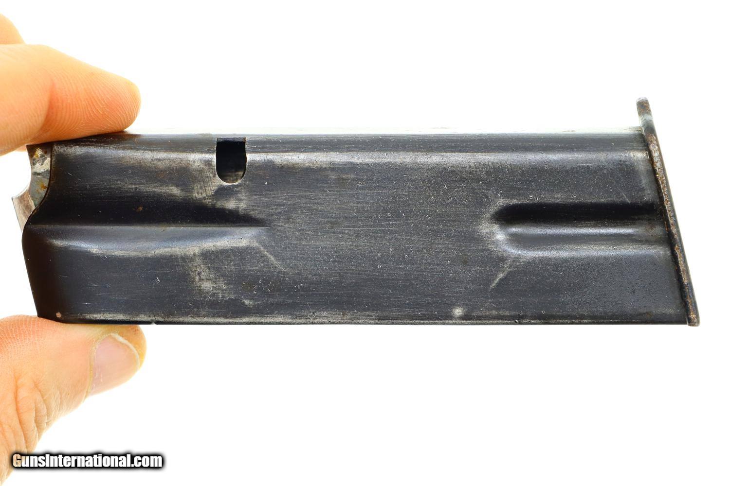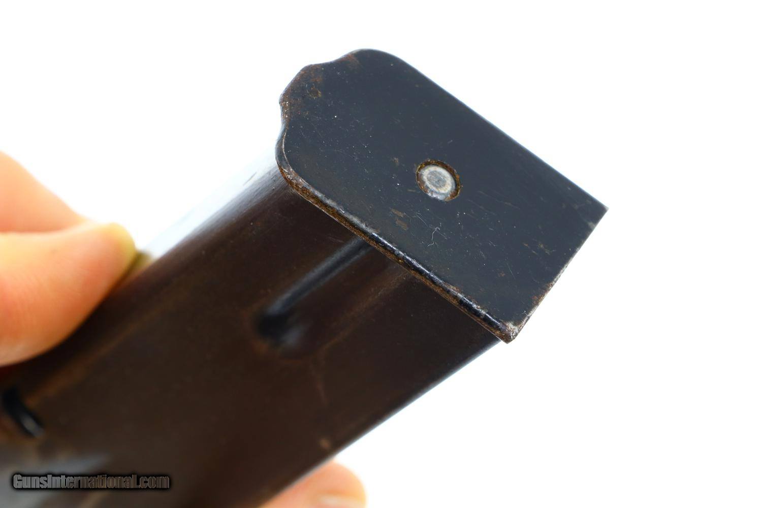 Description: Early post-war FN HP magazine, circa 1950s, with aluminum follower and button-detachable floorplate. Typically fitted to the West German police pistols. HIGH CAPACITY MAGAZINE. WON'T SHIP TO RESTRICTED STATES!!!! Synopsis: Early post-war FN HP magazine, circa 1950s. Condition: G/VG ~~Insured shipping fee of $35; most packages shipped using FedEx 2nd Day.~~ SOLD Manufacturer: FN Caliber Info: 9mmP |
