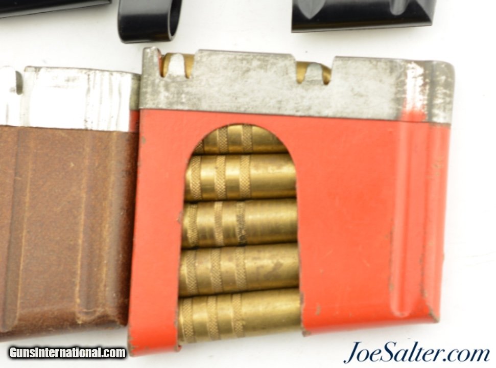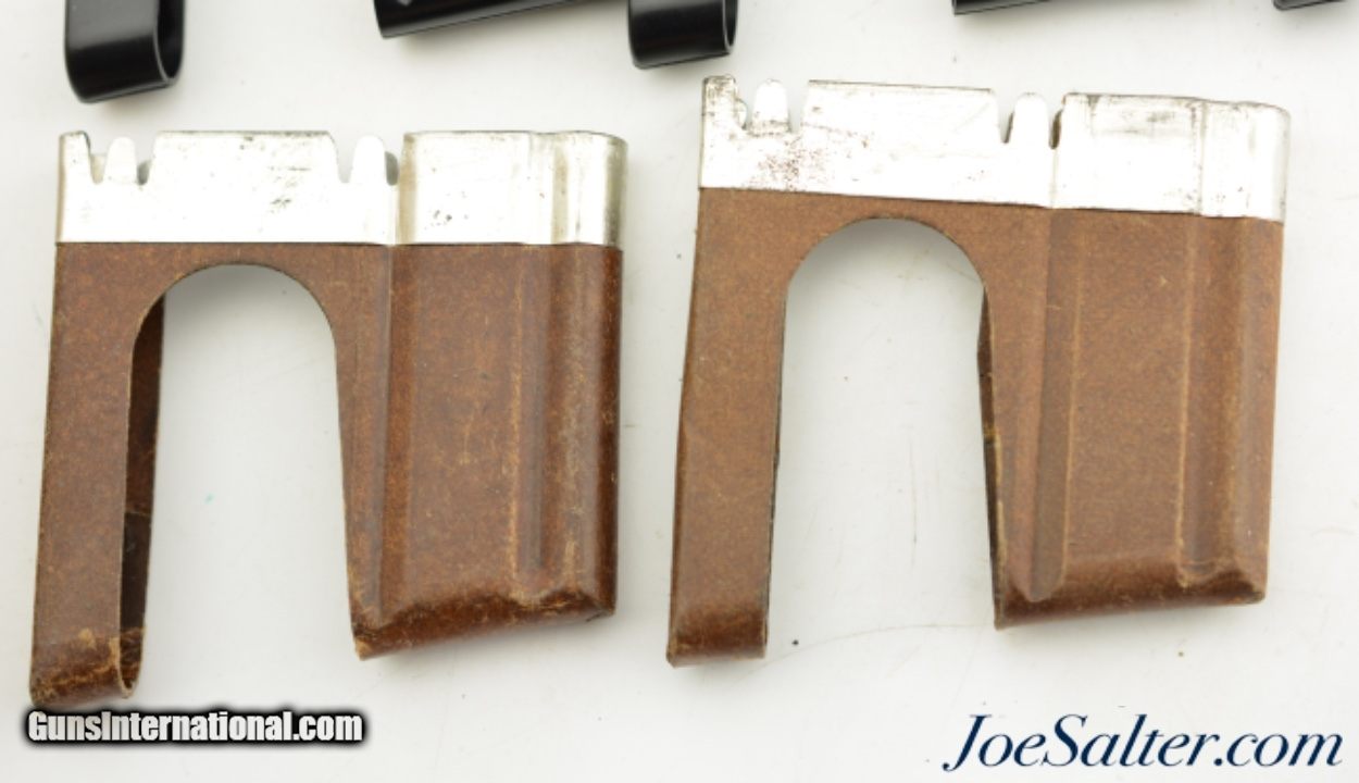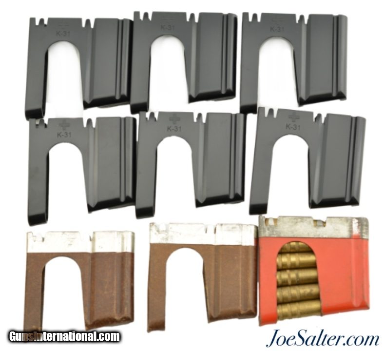 Description: This is a group of 9 6 round stripper clips for the Swiss K-31 Schmidt Rubin consisting of 6 polymer clips marked with a Swiss + and K-31 in like new condition, 2 originals stamped with the 6 and 1 original with 6 military dummy round. SOLD |