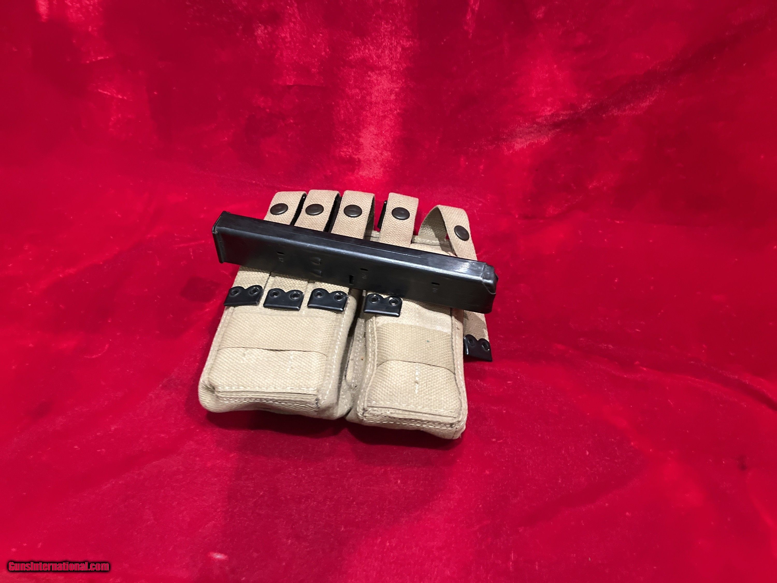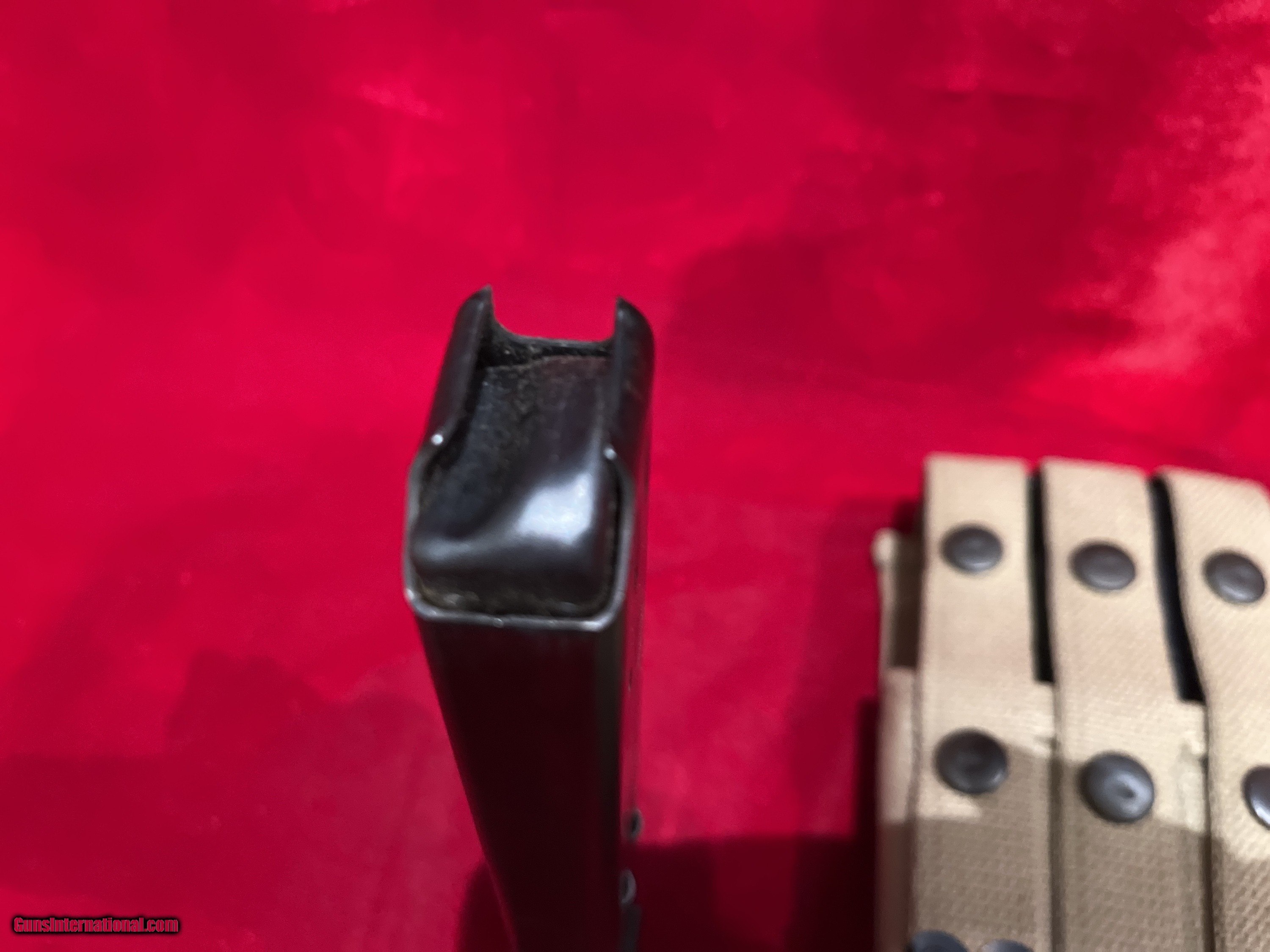 Description: A rare find, an original set of Uzi Military surplus mags with the original mag pouch. This is a 5 pack mag pouch. These are all the same, marked with a production number on the back side of each mag. The numbers vary but all are mint and new old stock. All are 32 round mags. Mint Cond. 360 dollars for all five mags and the pouch. 24 dollars for USPS Priority Mail Shipping. Not for sale in Ca. Price is firm. See photo's for condition. SOLD |