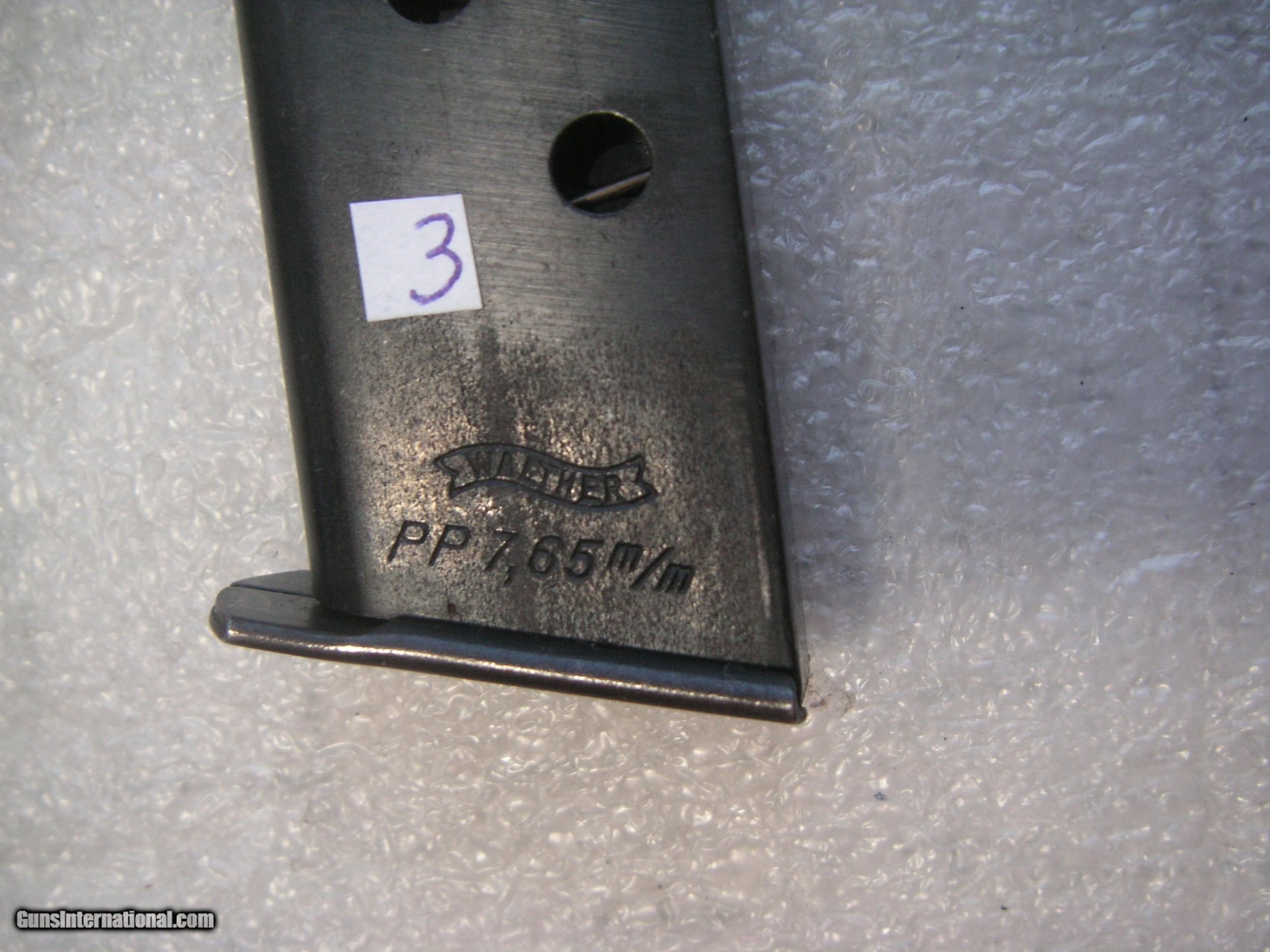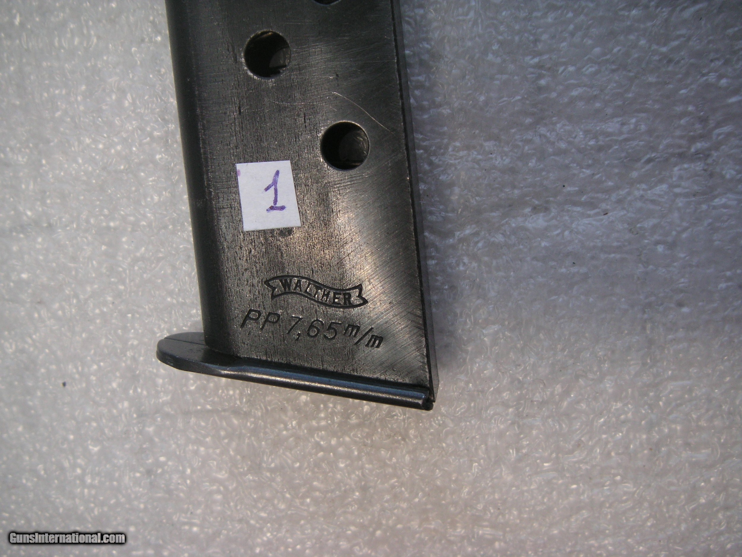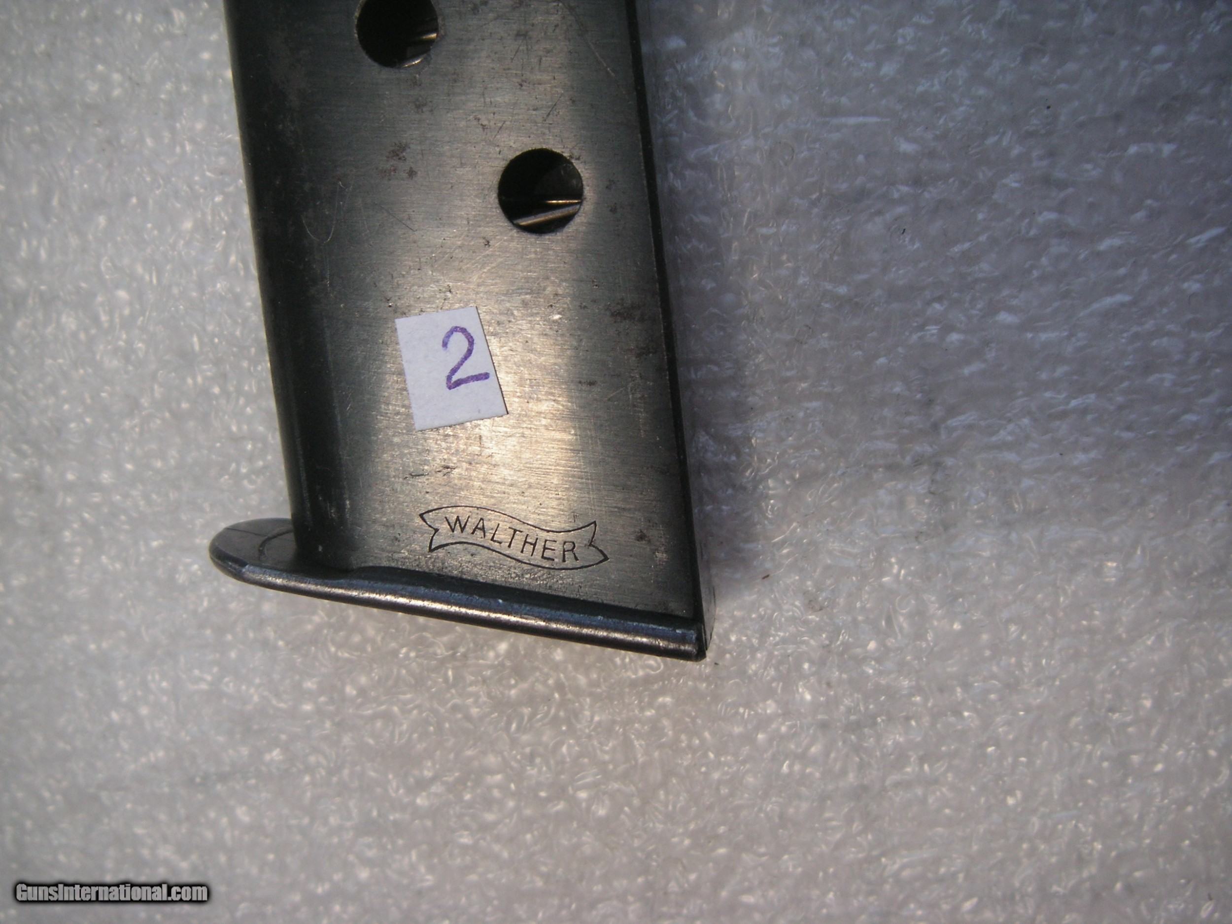Description: SEE THE PICTURES OF WALTHER MODEL PP & PPK CALIBER 7.65 mm (32 ACP) NAZI'S TIME PRODUCTION MAGAZINES IN EXCELENT FACTORY ORIGINAL CONDITION: 1) 3 WALTHER PP MAGAZINES NUMBERED 1, 2 & 3. PRICE PER EACH IS $175 PLUS $10 SHIPPING/INSURANCE #1 #2 & #3 are sold 2) 6 WALTER PPK MAGAZINES. ONLY #3 IS AVAILABLE, OTHERS ARE SOLD NUMBERED 3 ( VERY RARE NICKEL PLATED ) PRICE $175 PLUS $10 SHIPPING/INSURANCE #3 IS AVAILABLE NUMBERED 4, 5 & 6 PRICE PER EACH IS $175 PLUS $10 SHIPPING/INSURANCE SOLD Handgun Caliber: .32 ACP (7.65x17mm Browning SR) |