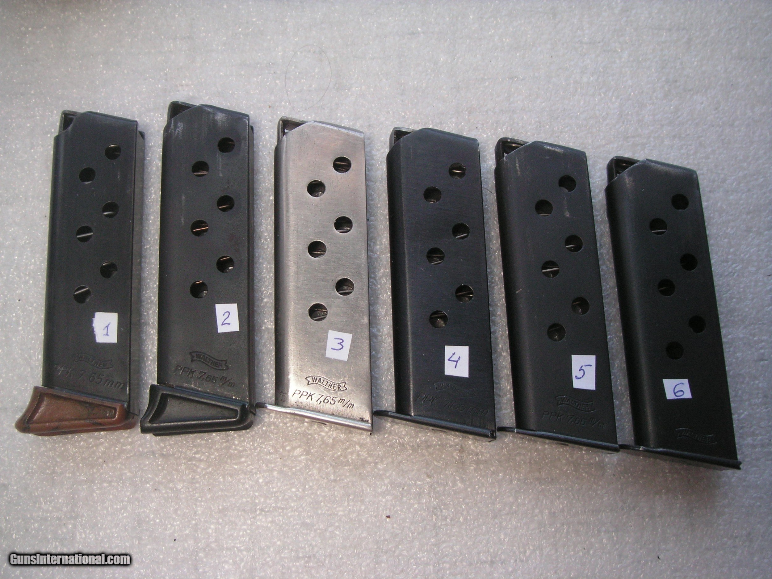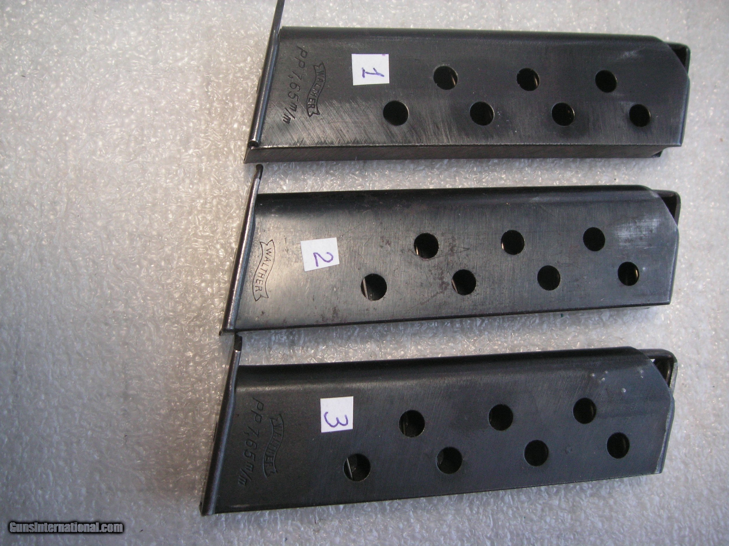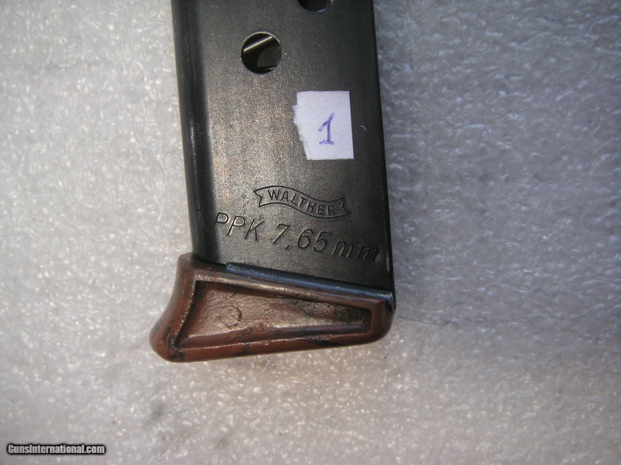 Description: SEE THE PICTURES OF WALTHER MODEL PP & PPK CALIBER 7.65 mm (32 ACP) NAZI'S TIME PRODUCTION MAGAZINES IN EXCELENT FACTORY ORIGINAL CONDITION: 1) 3 WALTHER PP MAGAZINES NUMBERED 1, 2 & 3. PRICE PER EACH IS $175 PLUS $10 SHIPPING/INSURANCE #1 #2 & #3 are sold 2) 6 WALTER PPK MAGAZINES. ONLY #3 IS AVAILABLE, OTHERS ARE SOLD NUMBERED 3 ( VERY RARE NICKEL PLATED ) PRICE $175 PLUS $10 SHIPPING/INSURANCE #3 IS AVAILABLE NUMBERED 4, 5 & 6 PRICE PER EACH IS $175 PLUS $10 SHIPPING/INSURANCE SOLD Handgun Caliber: .32 ACP (7.65x17mm Browning SR) |