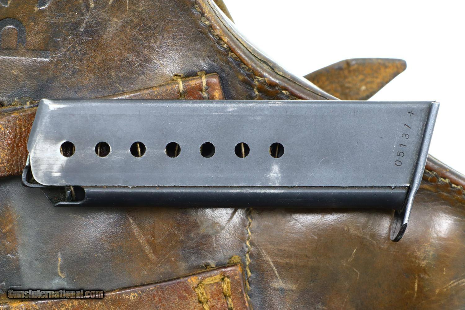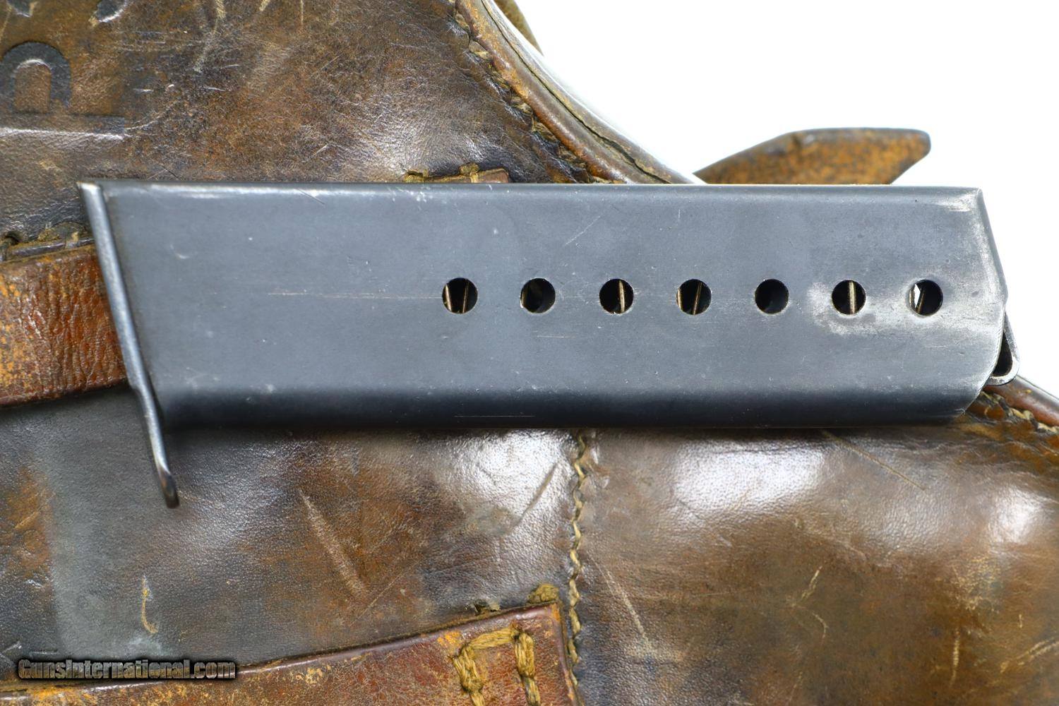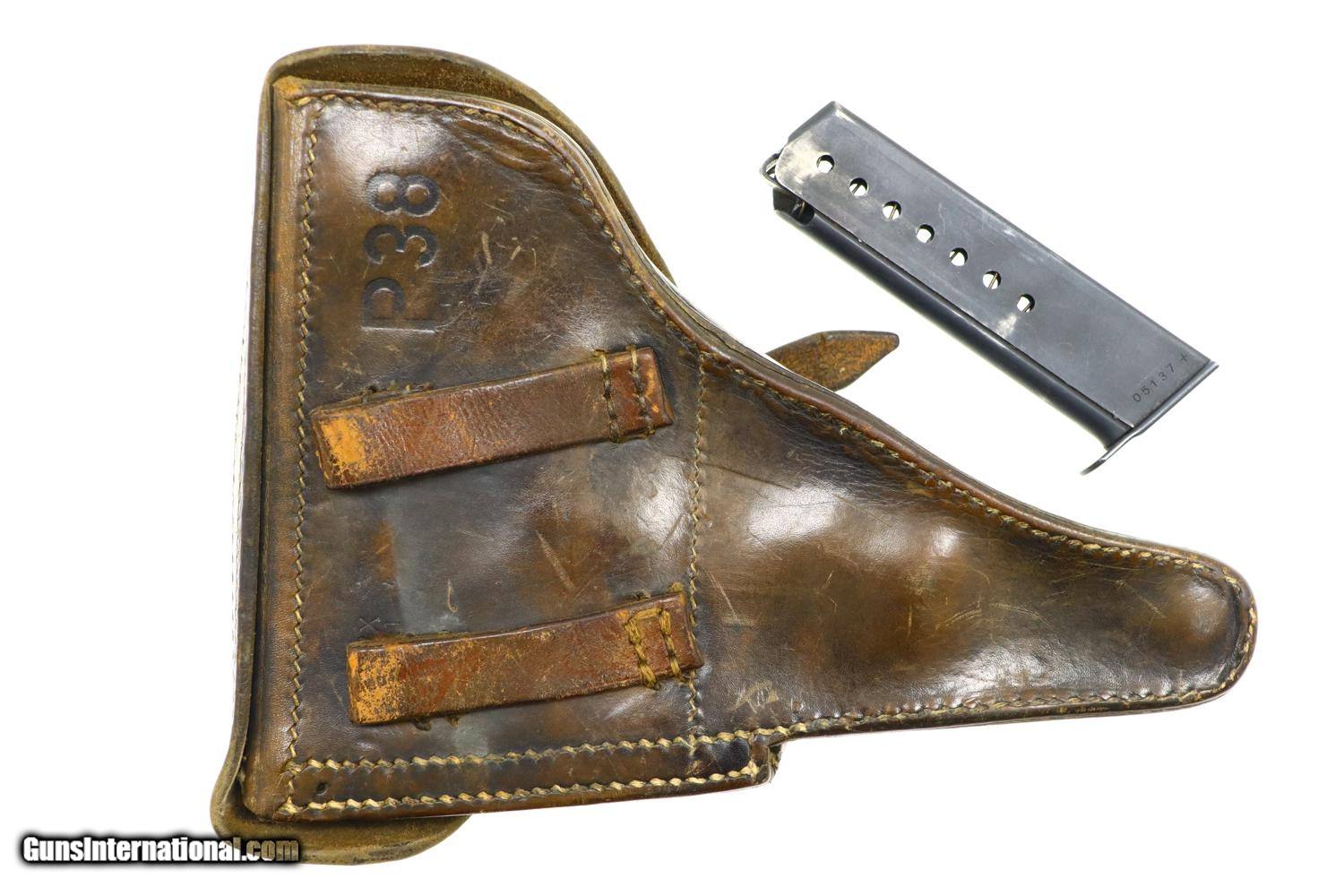 Description: Walther P38 hard shell holster dated 1941, loop for retaining strap missing, now with replaced strap and added buckle. Complete with original zero series, 3rd issue, magazine with paired Eagle 359 proofs at base of spine, numbered 05137+ on left side of magazine. Synopsis: Walther P38, Zero Series, Third Issue, Holster and Magazine, X-250 Condition: VG holster with securement modifications as detailed. Comparable condition, original finish, zero series, 3rd issue magazine. ~~Insured shipping fee of $35; most packages shipped using FedEx 2nd Day.~~ SOLD Manufacturer: Walther Serial Number: NSN Caliber Info: 9mmP |