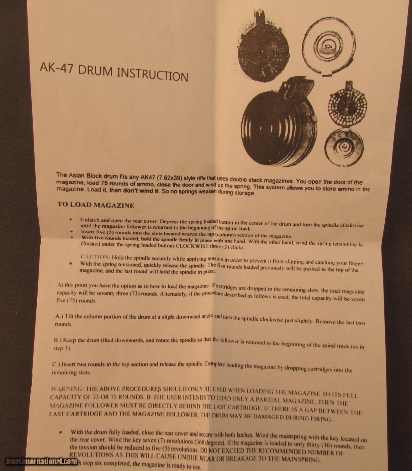 Description: This South Korean Manufactured drum magazine fits any AK with double stack magazine. it remains new in the box with instruction sheet, and still has factory shipping grease inside. SOLD Manufacturer: SGM Model: SAKD76275 Caliber Info: 7.62x54 Gauge Info: 7.62x54 |