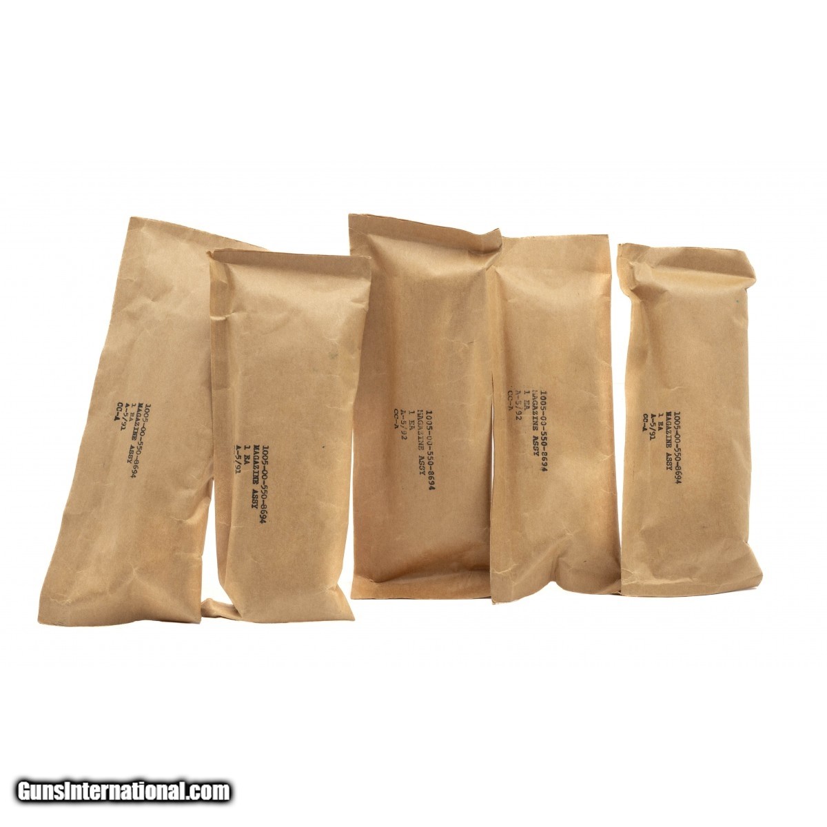 Five USGI contract 7-round magazines for the M1911A1 pistol. Magazines were made by Check-Mate Industries of Wyandanch, New York & they are brand new in unopened original factory packaging.