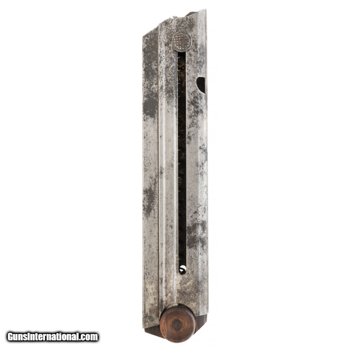 Description: " Commercial Luger unmarked wood bottom magazine. In good condition with patina. SOLD |