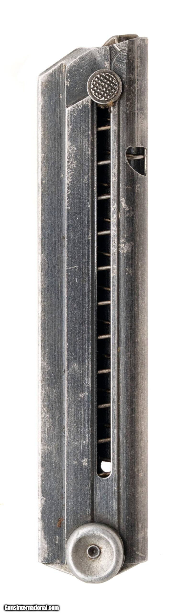 Description: "Original WWII-era 8-round Luger magazine in very good condition with light finish wear noted from use. Left side is marked “fxo / Eagle/37". Bottom right is stamped “P.08," and the aluminum base is marked with a faint “U" Spring and follower remain tight and function correctly. SOLD |