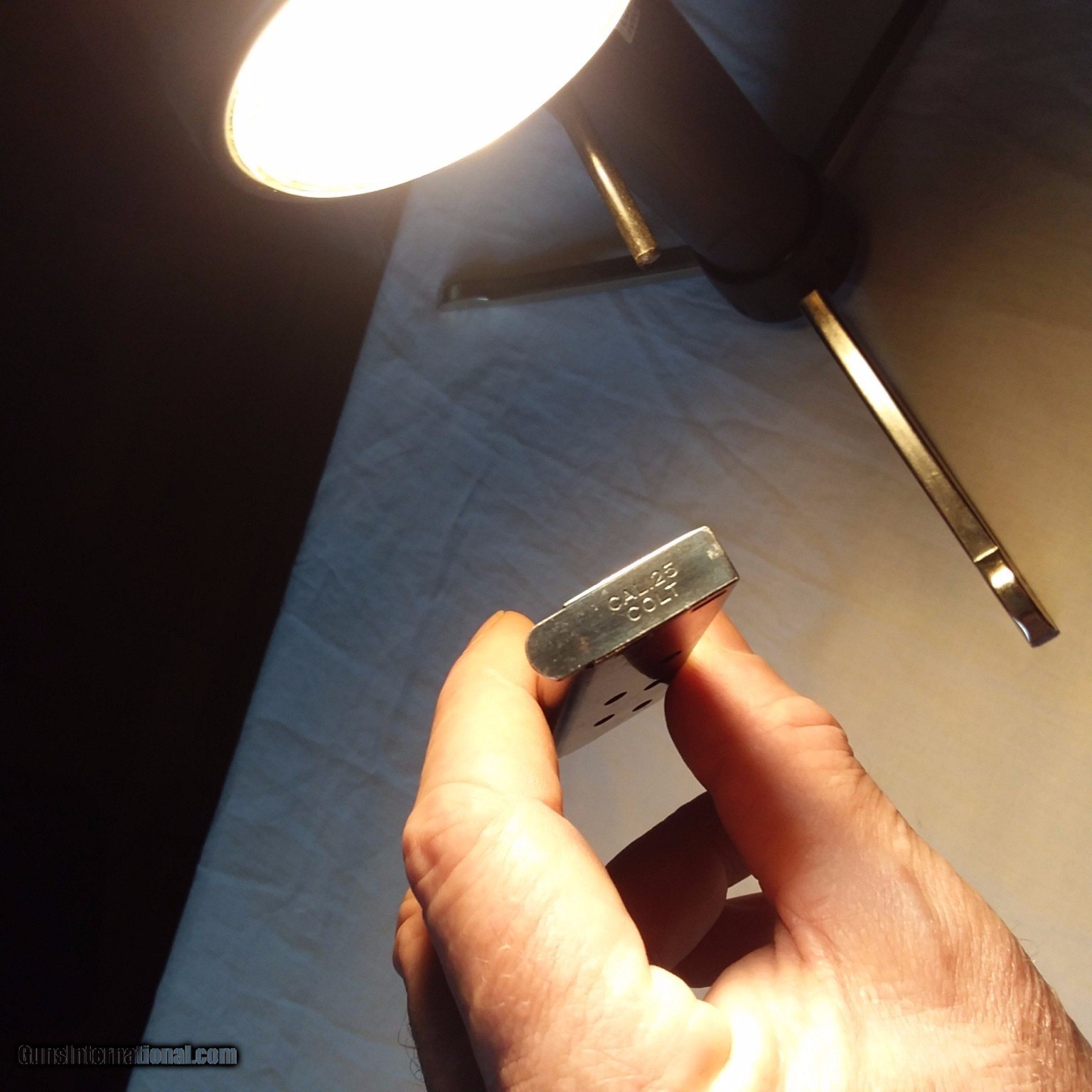 Description: For sale is an original 25 Cal. Colt two tone Vest Pocket Clip in excellent condition , 97% Bright Blue finish . Works well , hardly used . Nice as a spare or to put in a display box. $145 PLUS $5 SHIPPING . Pay Pal add 3 % , postal money order or bank check , no personal checks . Any questions contact or call 610-346-9416 SOLD |
