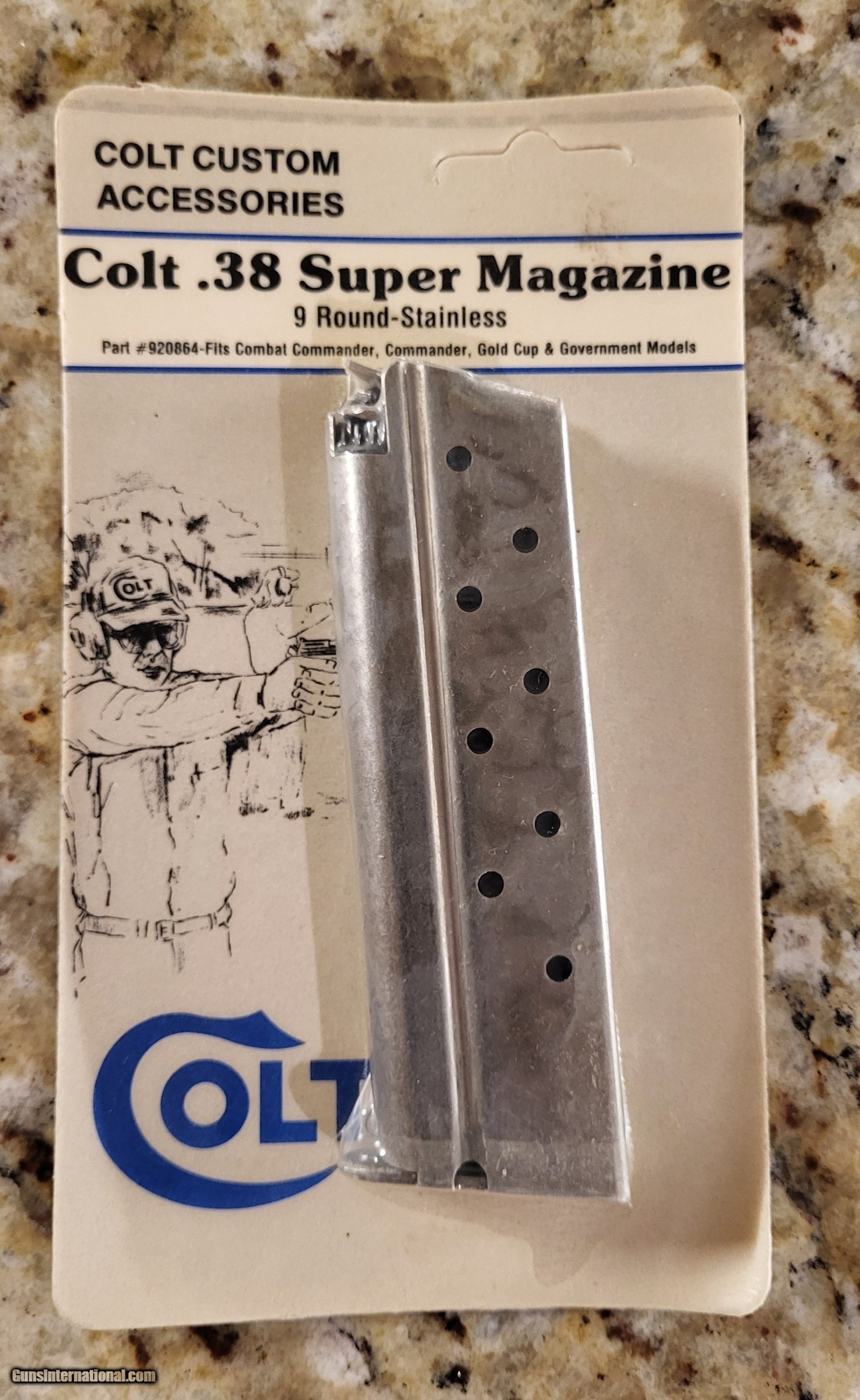 Description: *** LAST ONE *** FACTORY COLT 38 SUPER 9 ROUND STAINLESS MAGAZINES NEW. FITS GOV'T AND COMBAT COMMANDER MODELS. HAVE ONE LEFT. $10.00 INSURED SHIPPING. SHIP TO LOWER 48 ONLY. HAVE ONE LEFT. SOLD Handgun Caliber: .38 Super Auto |