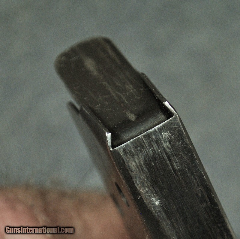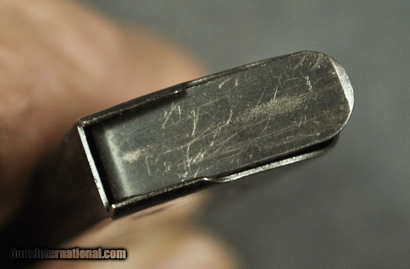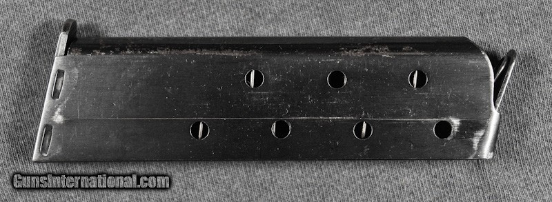 Description: Original factory Colt 8 round magazine for the 1903 Model M .32 caliber hammerless automatic pistol. This is an earlier magazine with the round upper front edge (1926 and earlier), but will function in all 1903 Model M pistols from the beginning of production in 1903 to the end of production in 1945. Excellent condition: most of the bluing remains with a little wear, no corrosion, and no dents. The feed lips are not cracked or bent. Price: $175.00 Shipping: $10.00 Contact Seller |
