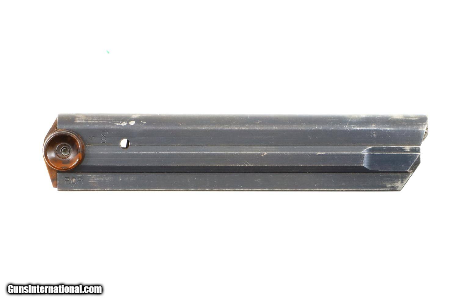 Description: Luger magazine, late extruded WWII, replacement base. Synopsis: Luger Magazine, Late WWII, Replacement Base, X-238 Condition: VG+ with replacement base. ~~Insured shipping fee of $35; most packages shipped using FedEx 2nd Day.~~ SOLD Manufacturer: Mauser Caliber Info: 9mmP |