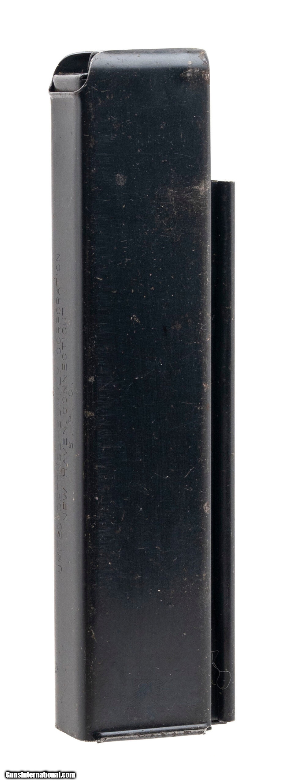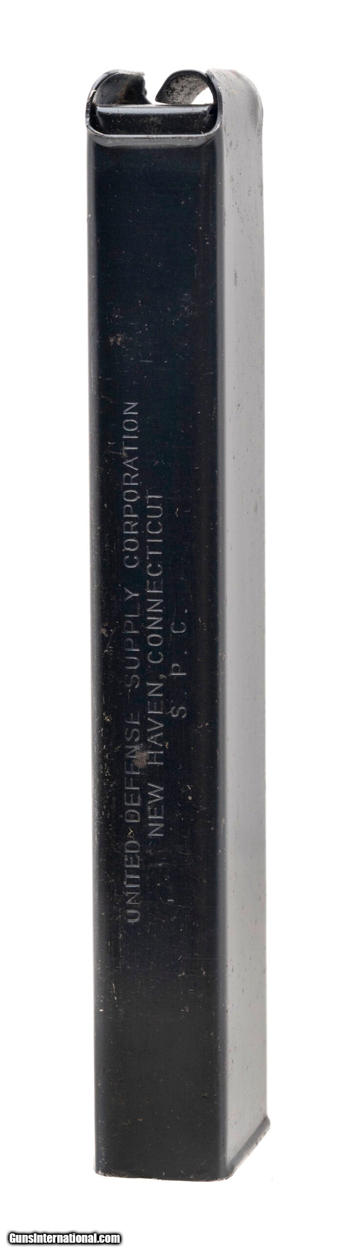 Description: "25-round magazine for the 9mm United Defense M42 SMG in excellent condition. Marked ""United Defense Supply Corporation - New Haven, Connecticut - S. P. C."" SOLD |