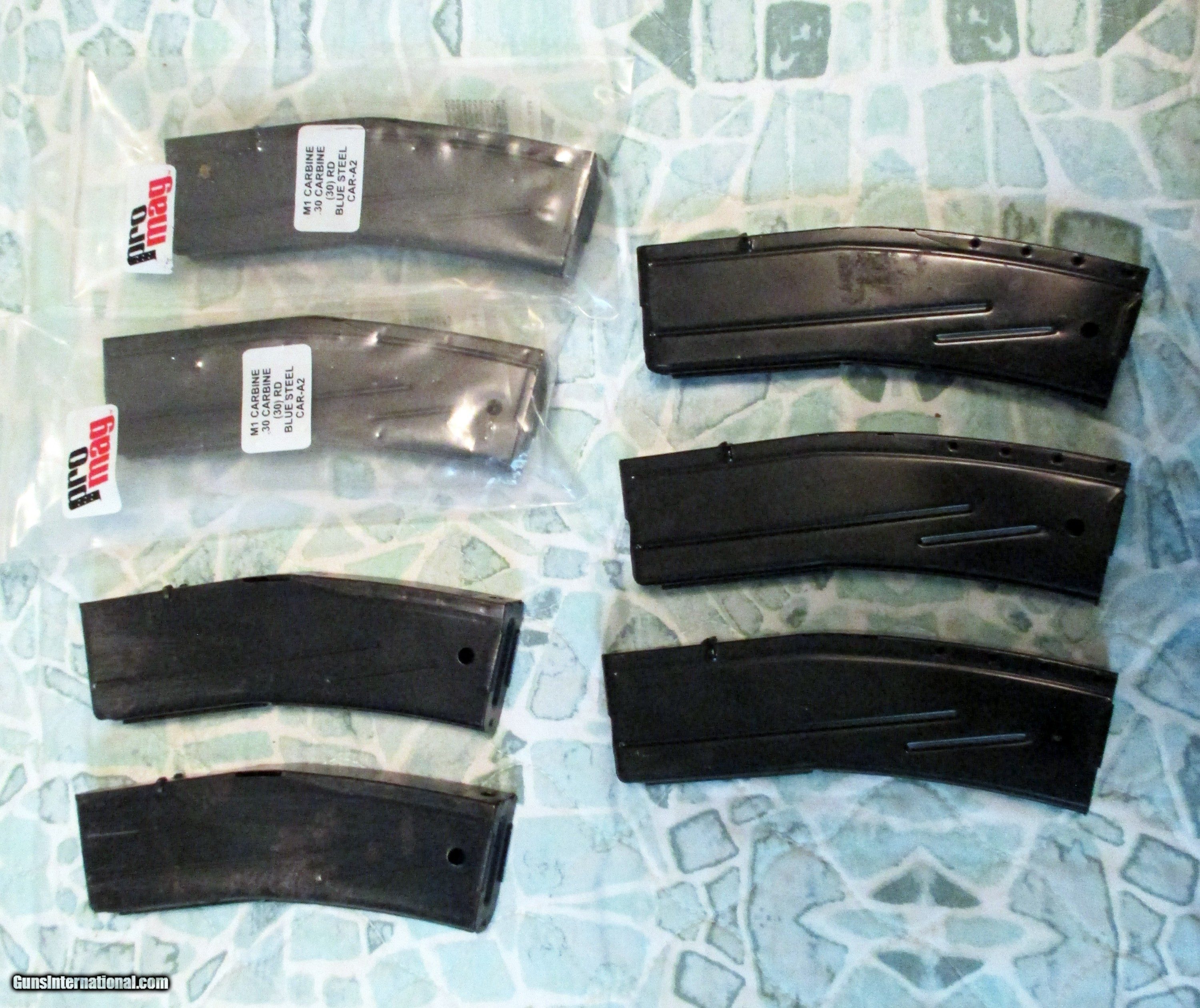 Description: Lot of seven, 30 round M1 Carbine magazines: 2 - new Promag; 3 - like new used marked "UU"; and 2- used marked "N.V.S.". All have bolt hold open followers and good springs. Buyer pays $25 shipping and insurance. SOLD Rifle Caliber: .30 Carbine |