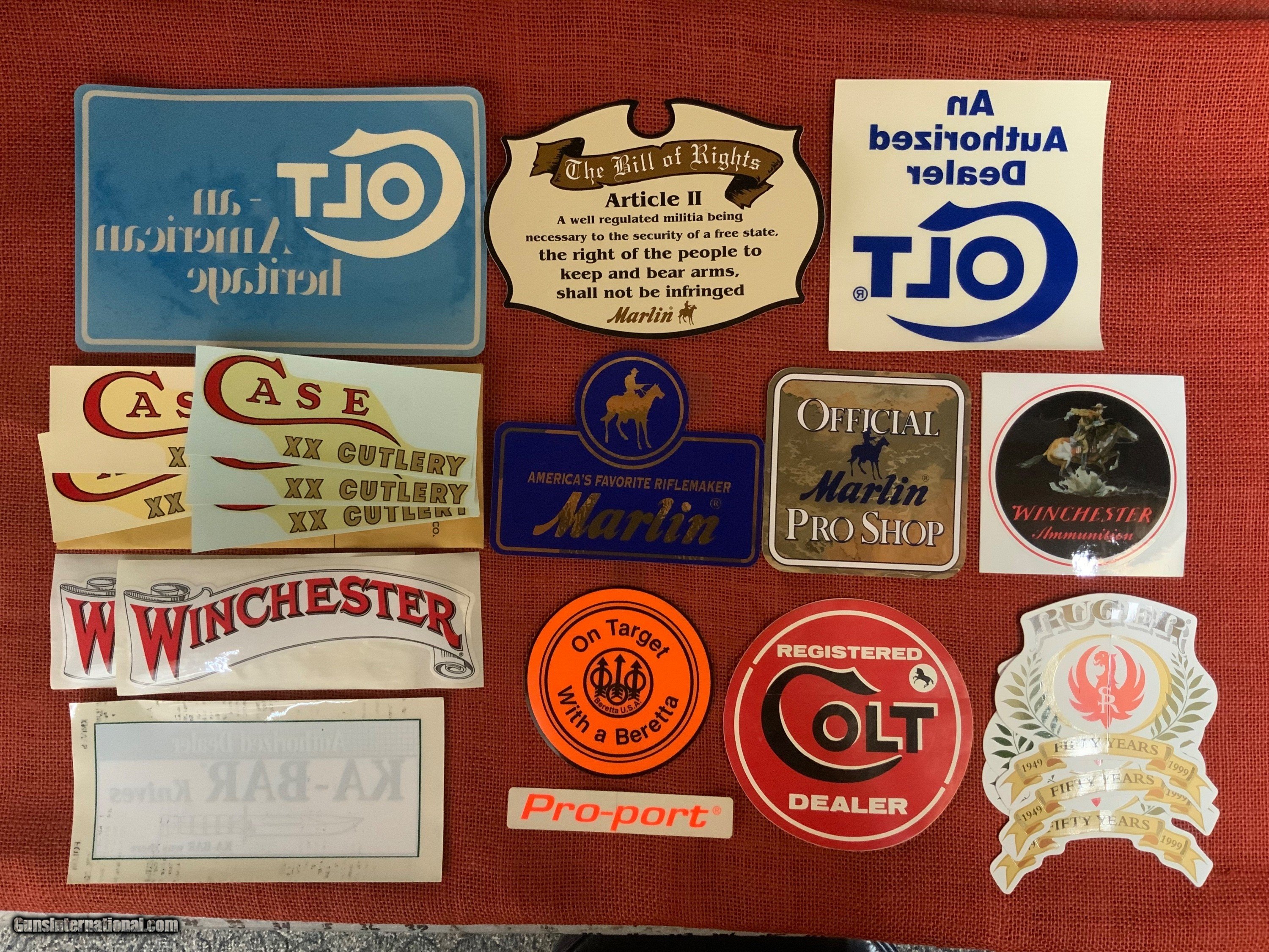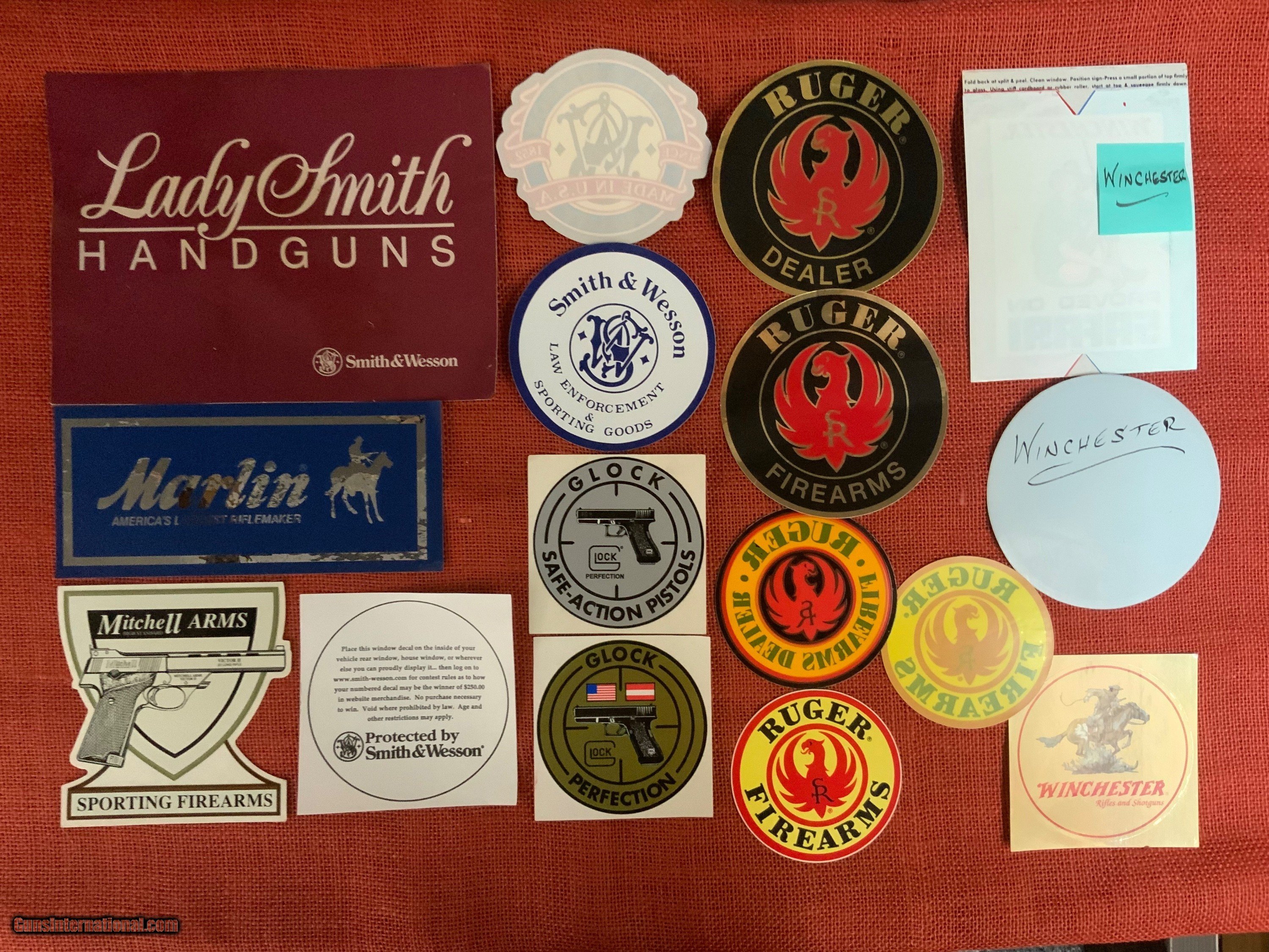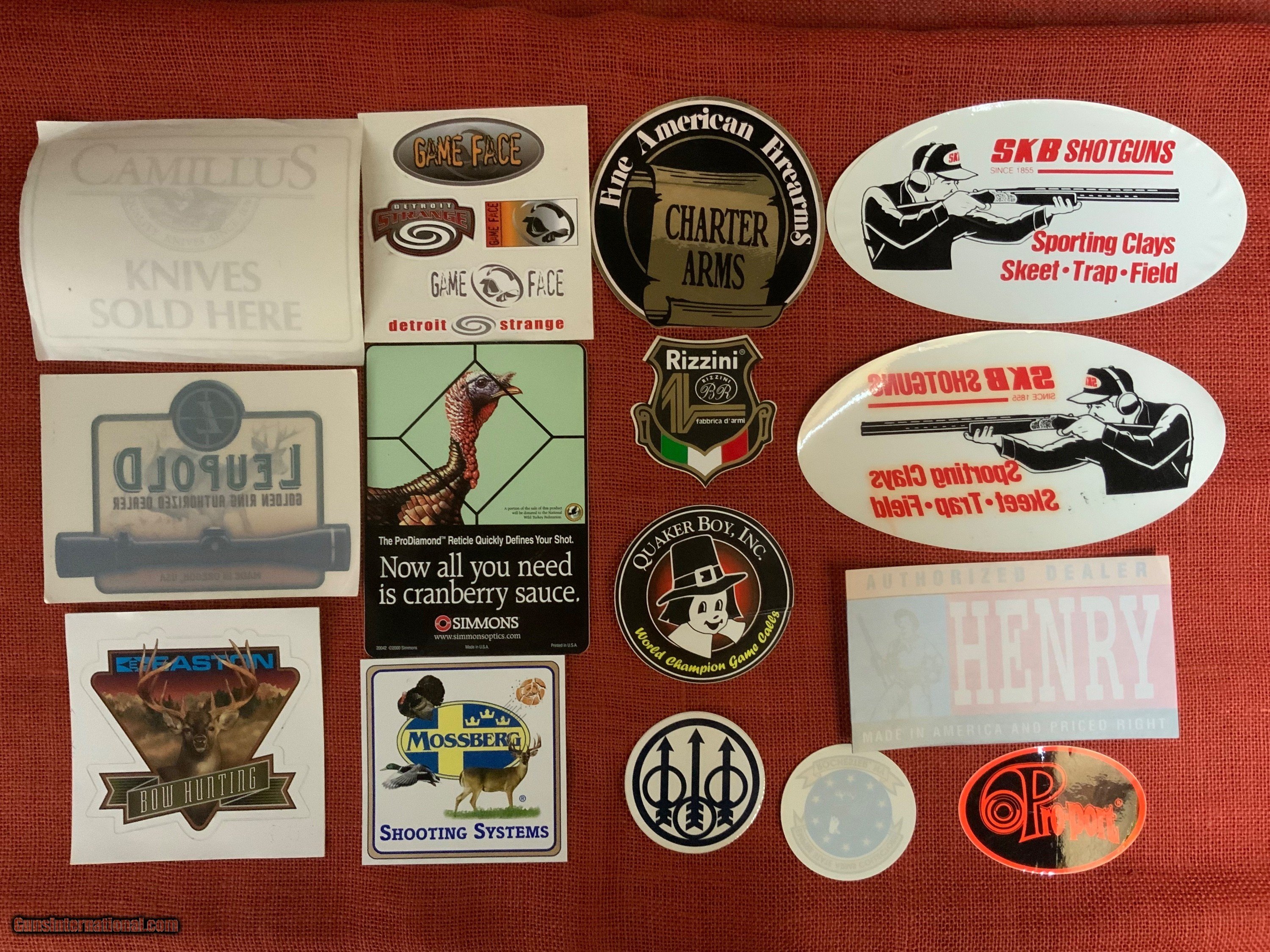 Description: ASSORTED DECALS-50 DECALS-SOME ''DEALER ONLY''- SMITH&WESSON-COLT-GLOCK-RUGER-WINCHESTER- MARLIN-BERETTA-PRO PORT-MOSSBERG-SKB-HENRY- RIZZINI-CHARTER ARMS-LEUPOLD-SIMMONS-CAMILLUS- EASTON ARROWS-QUAKER BOY-MITCHELL ARMS-CASE- $100-add$10 priority shipping-M.O.only please. Price: $100.00 Shipping: $10.00 Contact Seller |