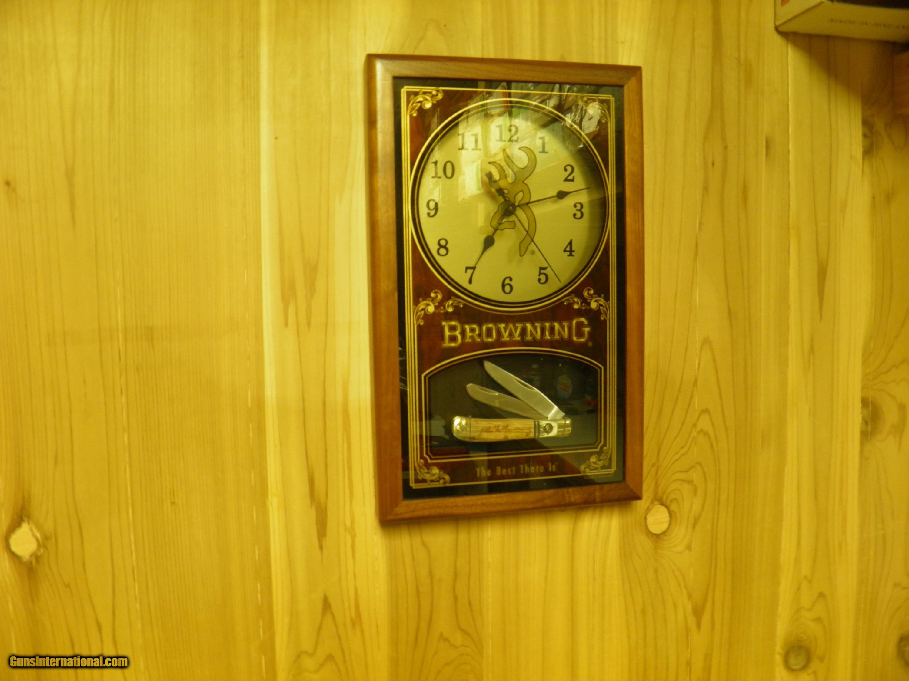 Description: BROWNING FULL LINE STOCKING DEALER ITEMS,#C1 A VERY NICE WALL MOUNTED CLOCK, WITH A JOHN M BROWNING FOLDING COLLECTABLE KNIFE WITH BONE HANDLES, GLASS FRONT WITH GOLD TRIM, BUCK MARK LOGO AND TRIMMED IN DARK WALNUT WOOD, OPERRATES ON AA BATTERY, MEASURES 15 1/2" HIGH X 10" WIDE, A "NEW" NICE ATTRACTIVE PIECE, "SOLD", #C2, AUTHORIZED BROWNING DEALER, SHELF OR COUNTER TOP, BACK LITE SIGN , LAZER CUT 3/8" THICK LEXON, READS "BROWNING" WITH THE BUCK MARK LOGO , REST IN OAK BASE, LIGHT FROM A 3WATT BLUB, 110 VOLT, WITH ON & OFF SWITCH, MEASURES 10" HIGH X 12" WIDE. IT APPEARS THAT THE DEALERS GOT ALL THE AWESOME BROWNING GOODIES!! $149.95 SOLD |