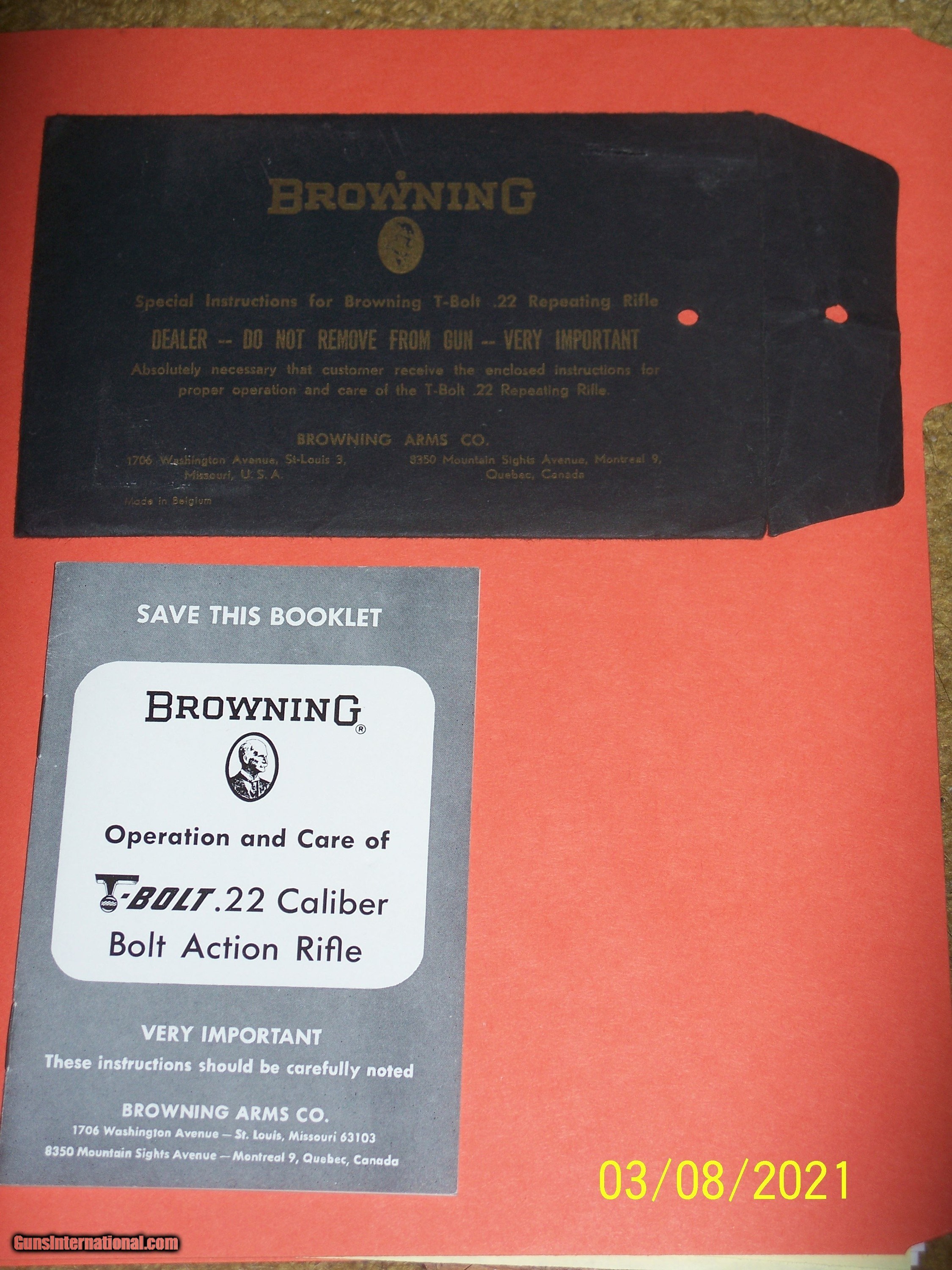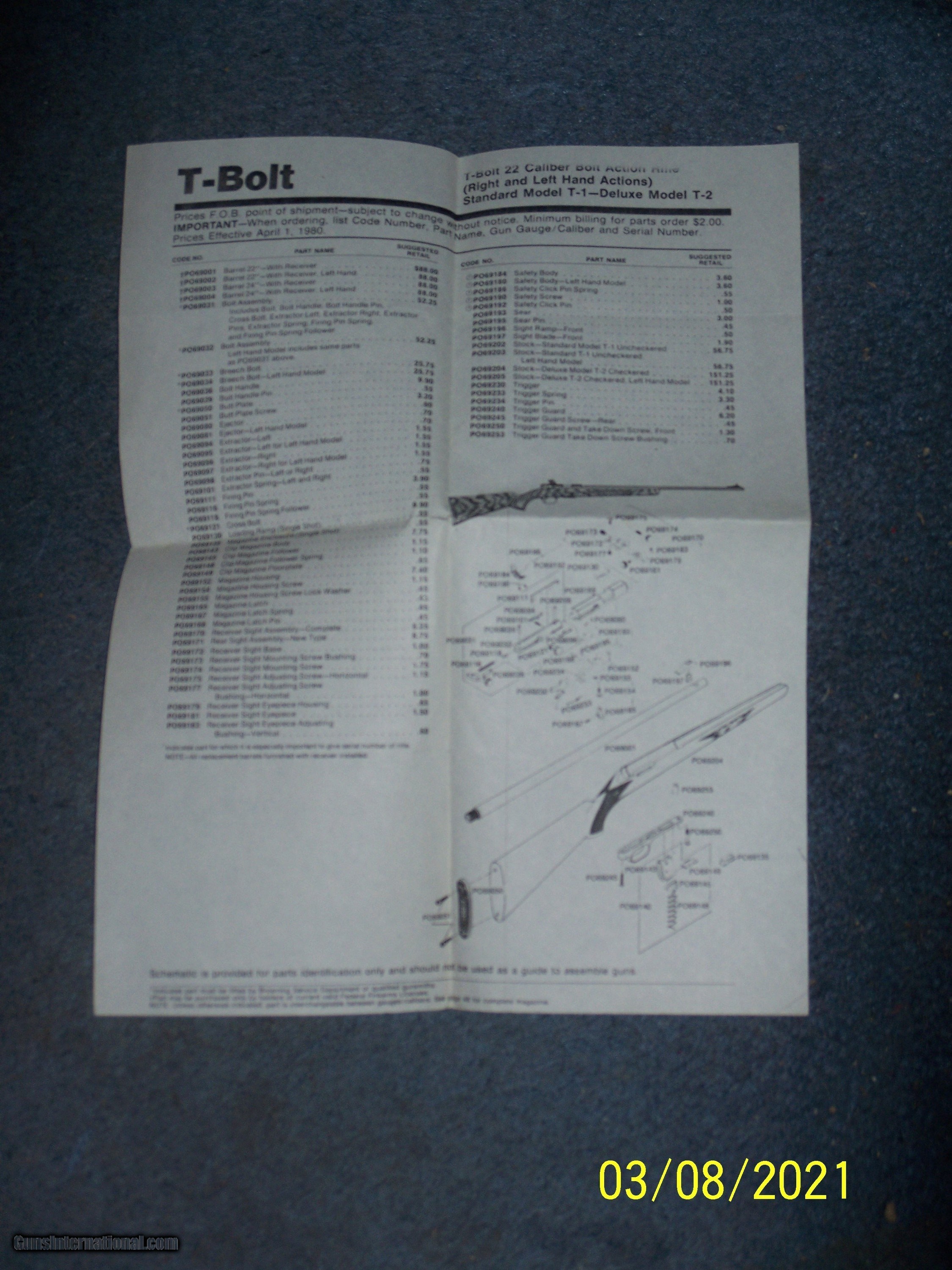 Description: Factory Browning manual for original T Bolt 22 rifle, in mint condition, includes parts list as shown, and free shipping. NOTE - we sell ONLY Factory manuals, NOT reprints ! SOLD |