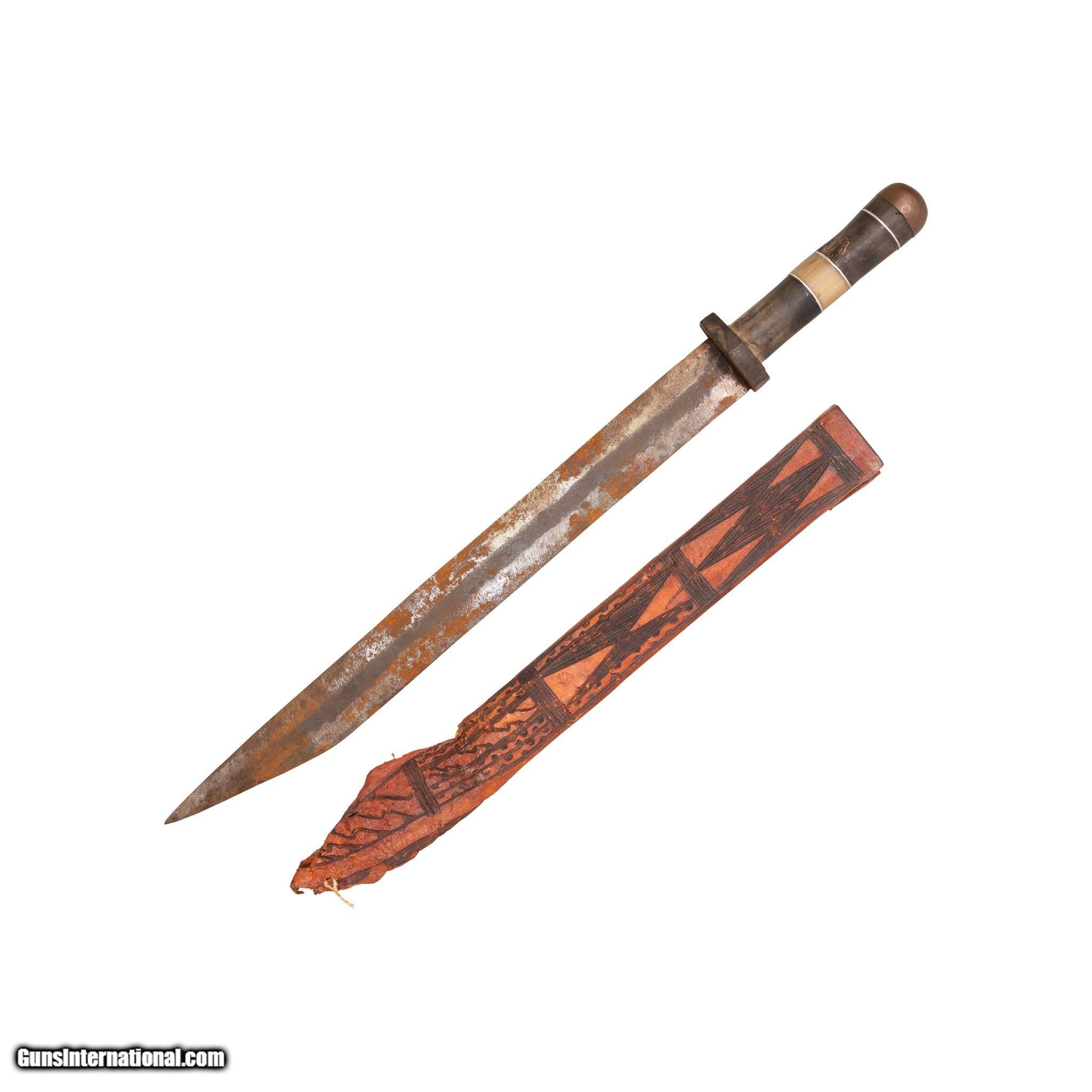 Description: This knife was owned by John Hart (The Lone Ranger) out of his personal collection. The grip is made of horn and pommel cap is brass. John fought in WWII and this could have been a fighting knife of his. Included is a copy of his DD214 Discharge which lists his military service and credits. Participated in the Battle of Luzon in the Pacific. John was a 1st Sergeant. John also saved mementos of his films. This could have been used in one of his films such as Jack Armstrong All American Boy or the Adventures of Captain Africa. Also included is a certificate of authenticity signed by his agent Mick Lafever. PERIOD: Mid 20th Century ORIGIN: United States SIZE: Blade 13" Overall 17 SOLD |