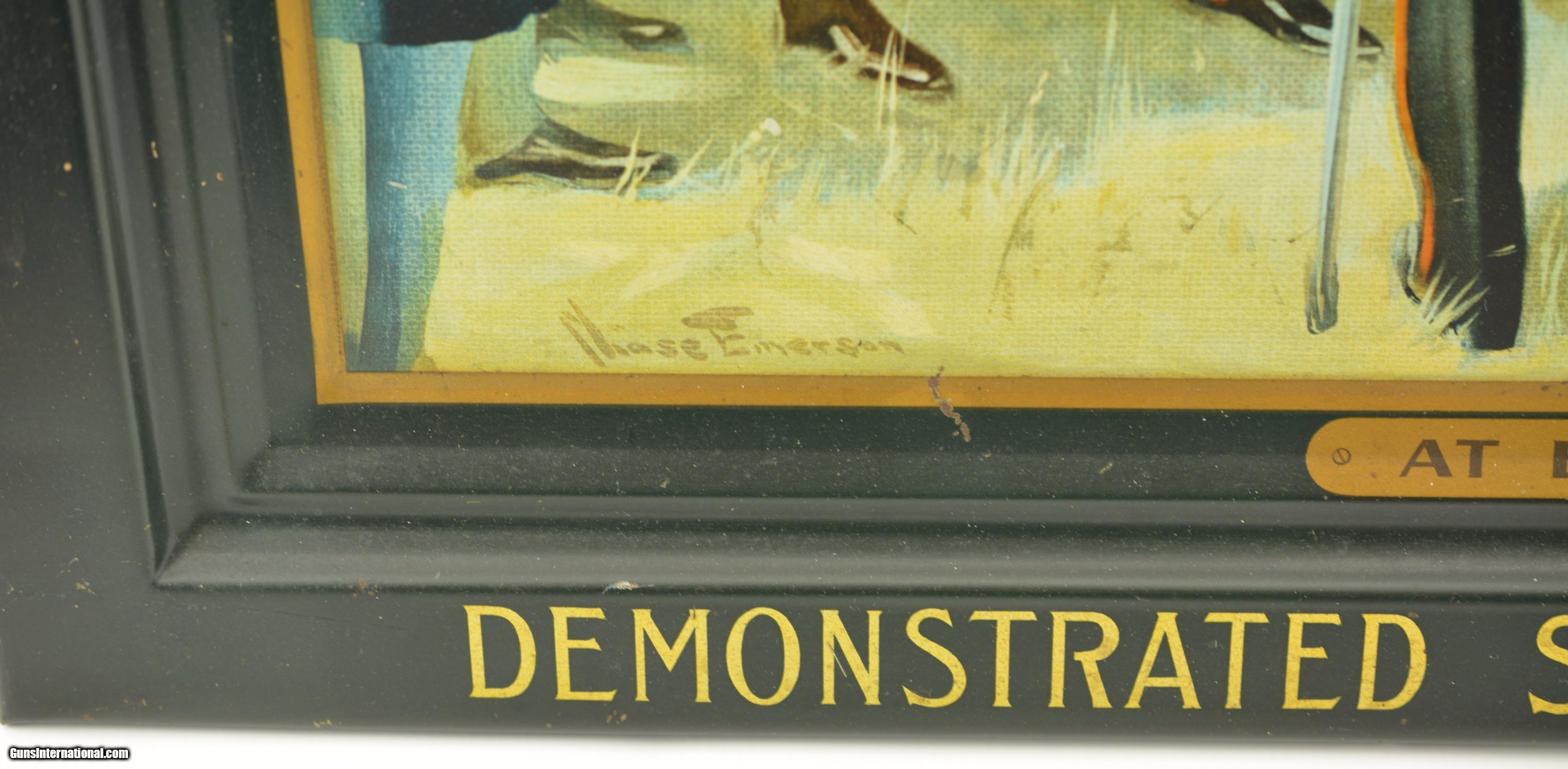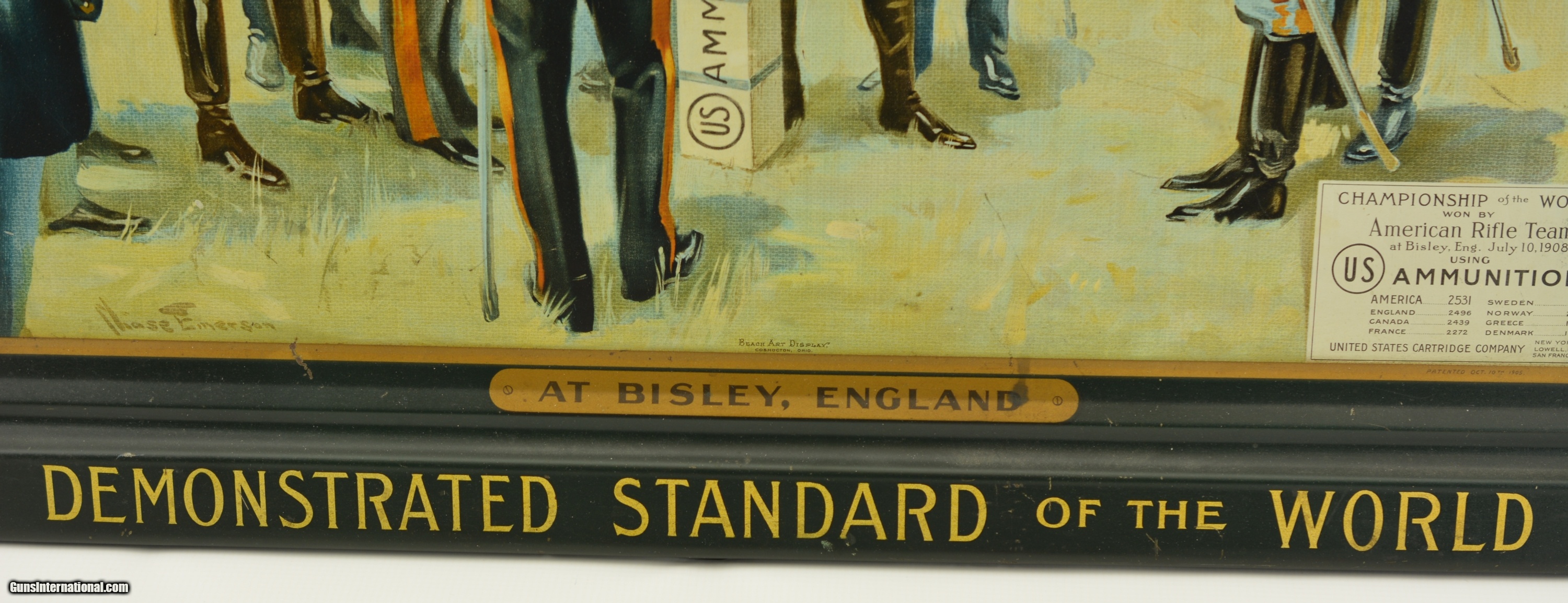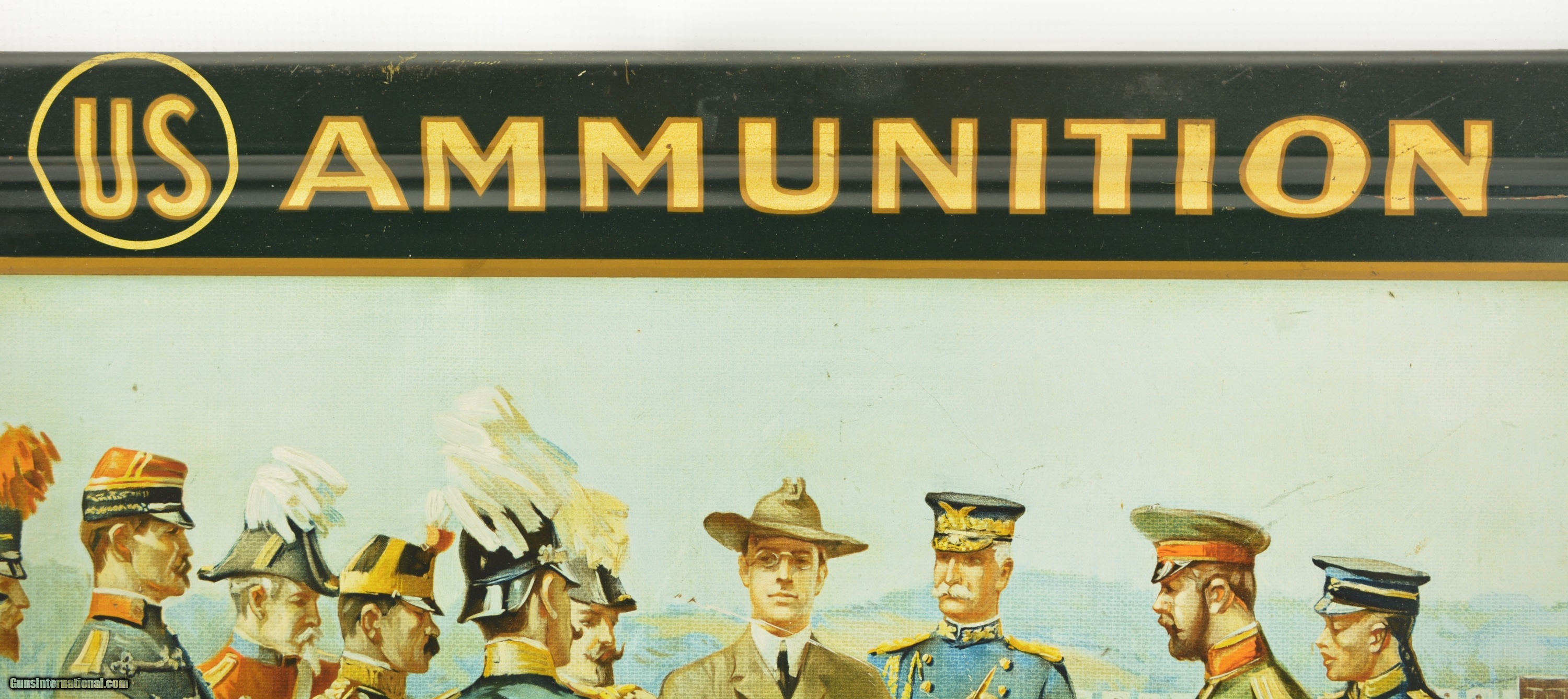 Description: This is a rare, original wall tin, illustrating a US Ammunition Co. representative extolling the virtues of his company’s products to American and foreign military officers attending the Bisley Matches. The tin measures 28 1/4" x 22 1/8" and has a black border with “US AMMUNITION" along the top; “DEMONSTRATED STANDARD OF THE WORLD" along the bottom; and a smaller “AT BISLEY ENGLAND" caption under the image. The results of the 1908 Bisley World Championship Matches is present in the lower right corner of the image (the USA won with England in 2nd Place). The tin is in excellent condition save for a single small area of dark oxidation in the middle of the image, but as it occurs on a dark portion of the picture, it is not evident without close examination. This is a fabulous example of one of the more attractive, and desirable advertisement tins. It would make a great addition to any collection, or decorative accent for a gun room or library. SOLD Manufacturer: US Ammunition Co. Model: Tin |