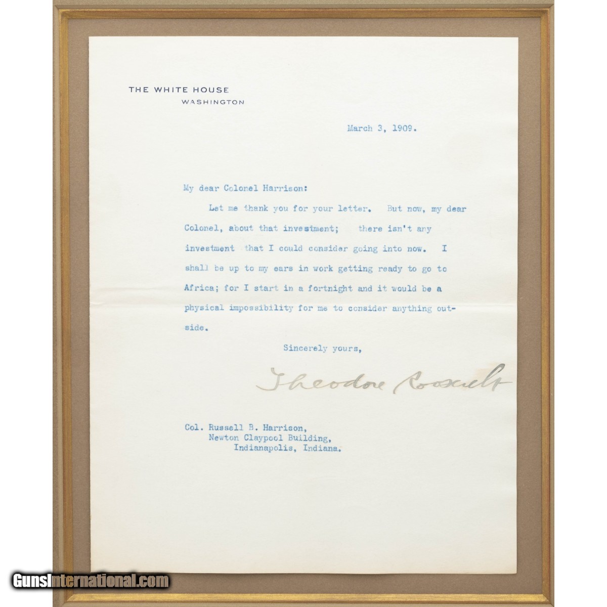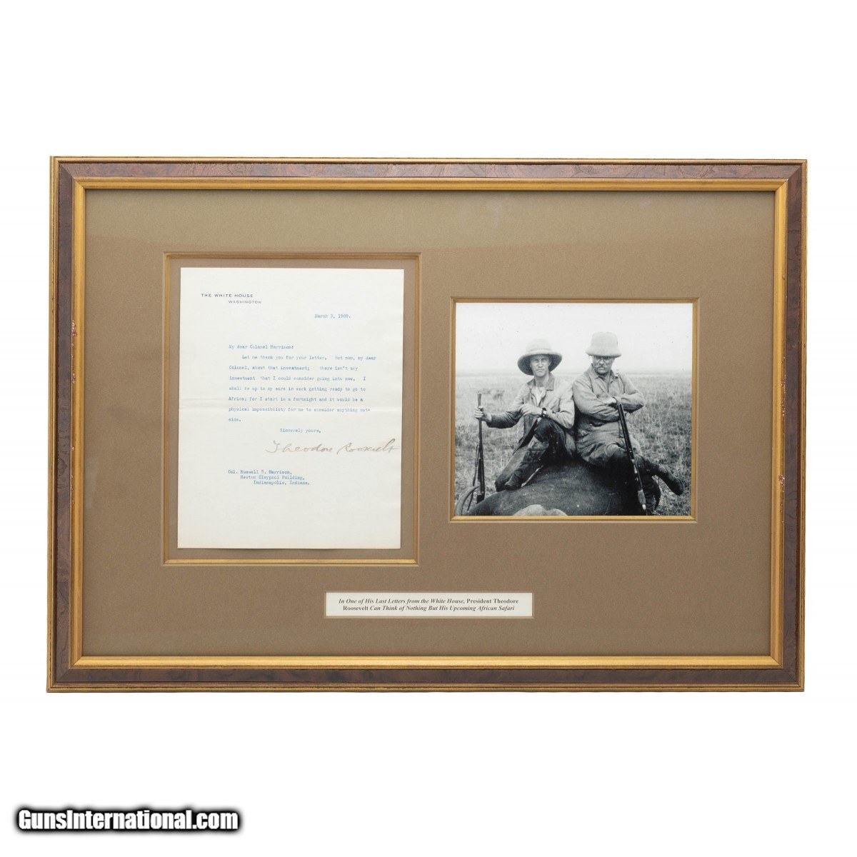 Description: " Signed letter from President Theodore Roosevelt near the end of his presidency expressing his excitement for his upcoming African Safari. Framed with a picture of President Roosevelt and game trophy from his safari. SOLD |