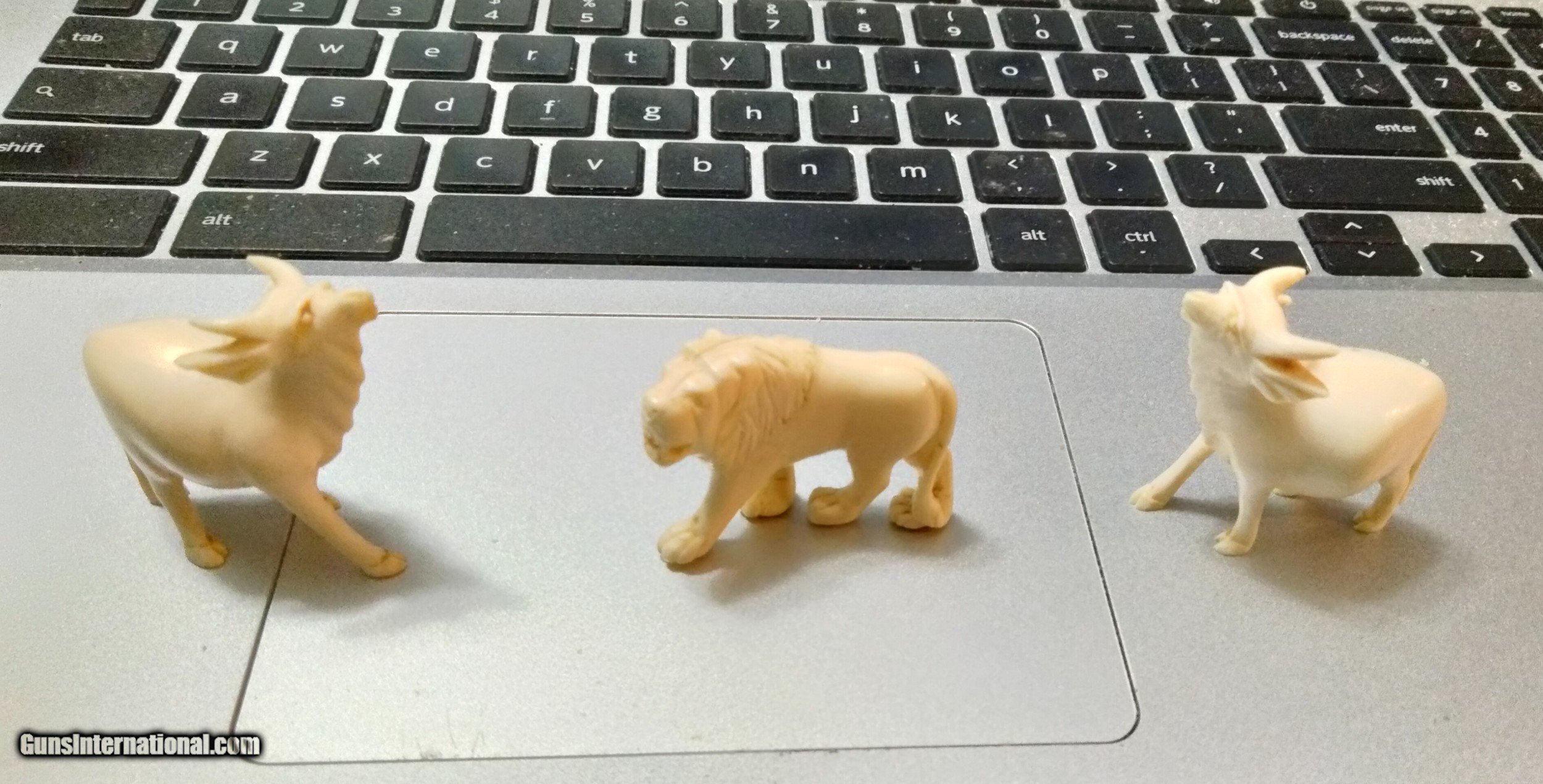 Description: Price reduced to $285.00 with 7 total pieces 2 water buffalo, a Lion and a nice collection of 4 finally carved elephants with tusks., 3 larger elephants and one smaller elephant carving. Larger is about 2 1/4 by 1/34 tall. No issues, breakage, look natural for age. Nice group for your desk, display, or cabinet. They have a nice solid weight. Not hollow. 7 total pieces. Great start for your collection. I promise careful packing and fast insured priority shipping. email any questions and I will always consider a reasonable offer. Good Luck. Sorry can not ship to Calif. or NY. Shipping $19.95 SOLD |