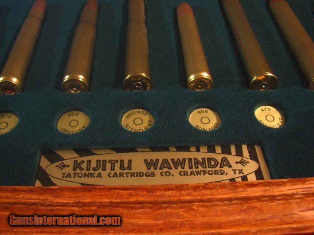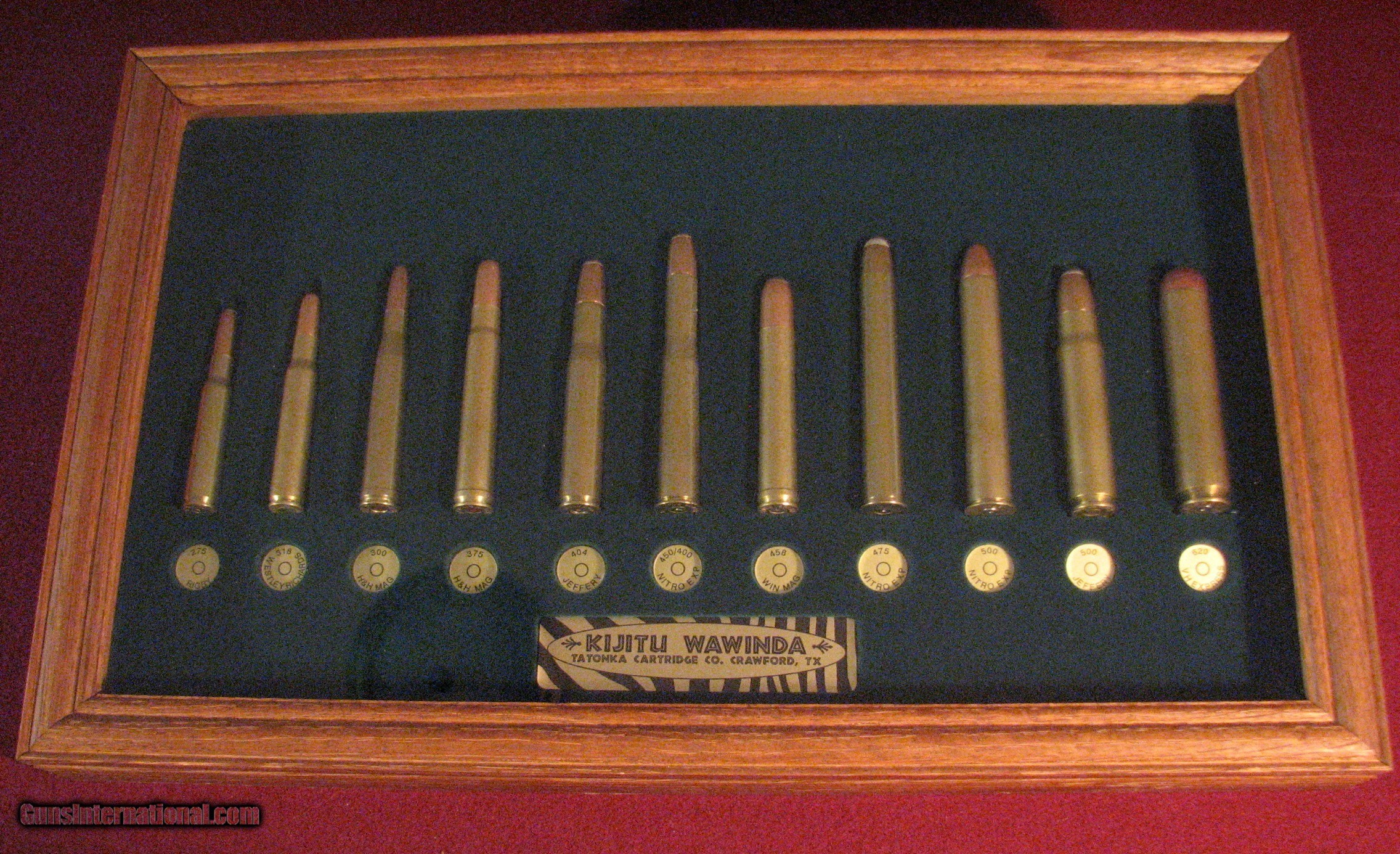 Description: Tatonka Cartridge Co., Crawford, Texas "Kijitu Wawinda" (Little Hunter) African cartridge board. Size 16 1/2"x 10 1/4" Glass front. Excellent condition. A great gun room or man cave display. Cartridges: 1- .275 Rigby 2- .318 Westley Richards 3- .300 H&H Mag 4- .375 H7H Mag 5- .404 Jeffery 6- .450/400 Nitro Express 7- .458 Win Mag 8- .475 Nitro Express 9- .500 Nitro Express 10- .500 Jeffery 11- .620 Van Horn Express SOLD |