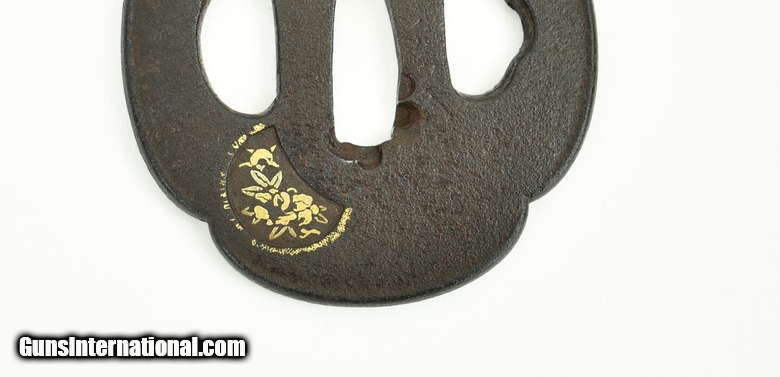 Description: "Iron Tsuba. Has Kinko insert of Shakudo Shi-Shi and 2 panels of gold foliage. Signed: first Kanji is Yoshi but following kanji is illegible. Tanto sized. SOLD |