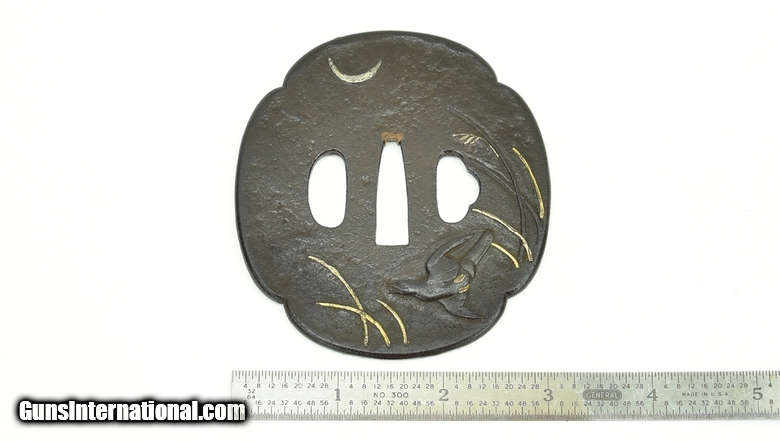 Description: "Iron Tsuba. Bird in flight with weeds, stream, and silver moon. Katana sized. No signature. SOLD |