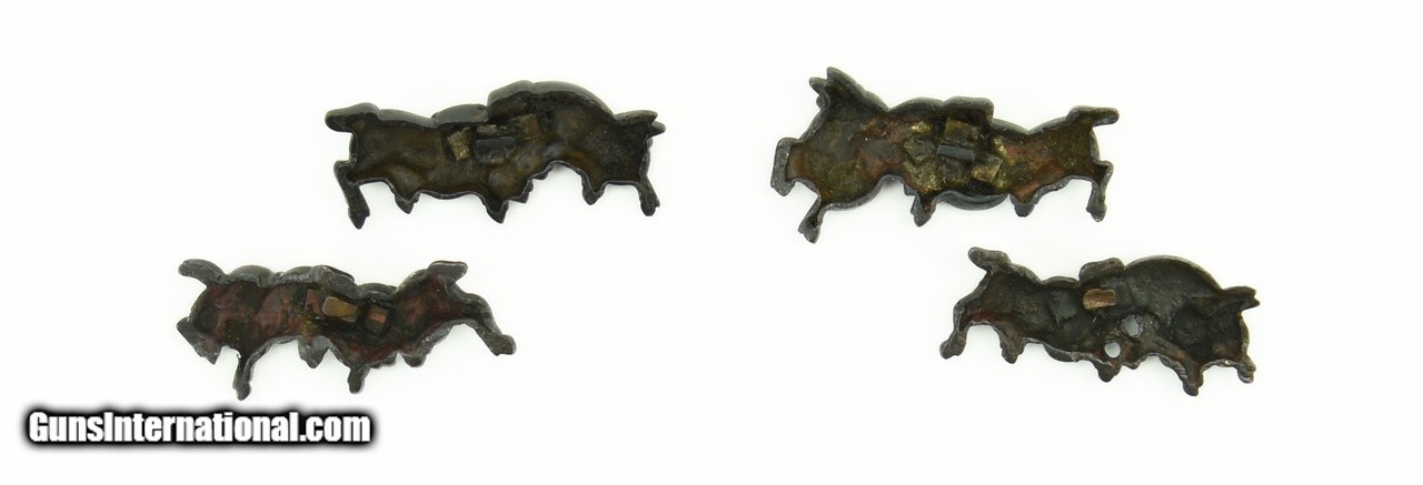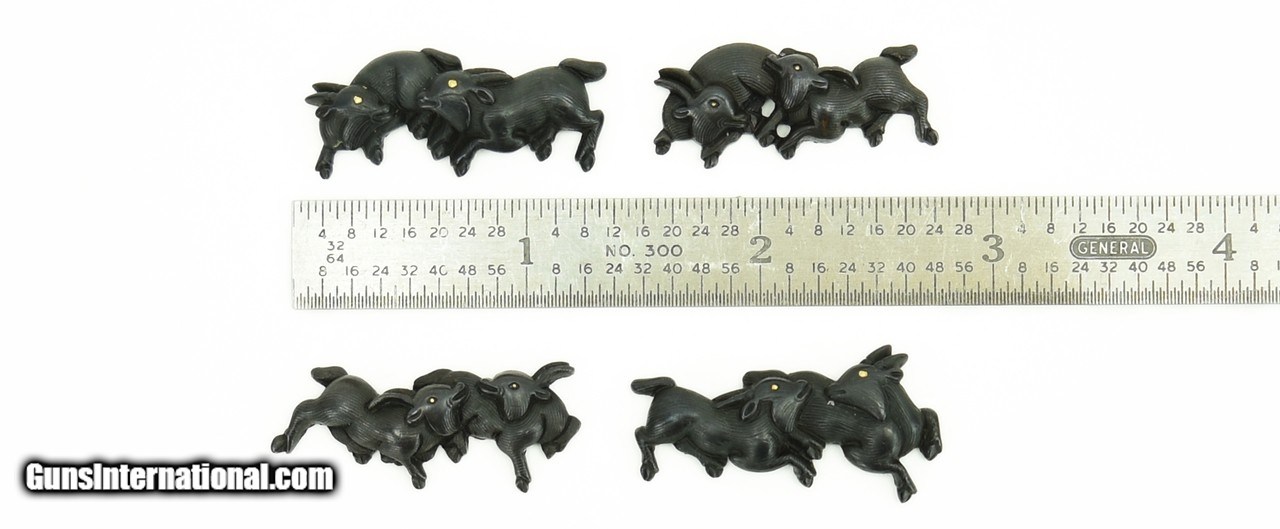 Description: "Kinko Dai-Sho Menuki. Shakudo with gold eyes on goats. SOLD |