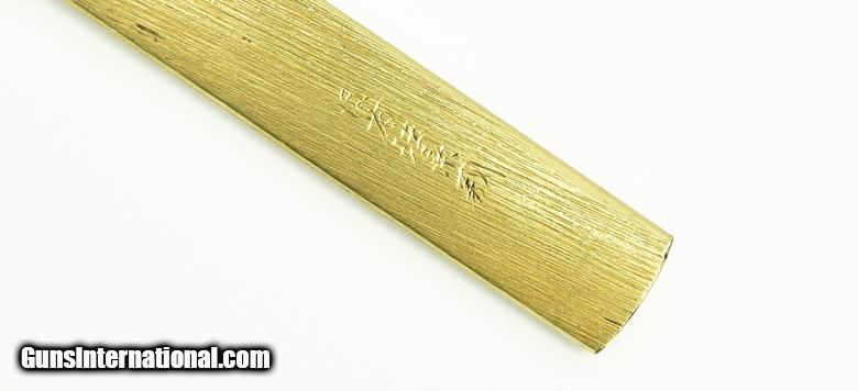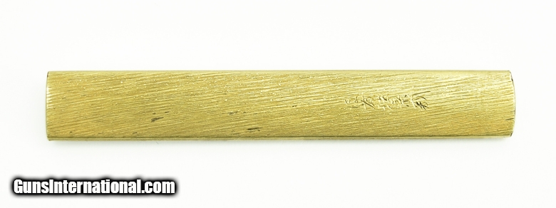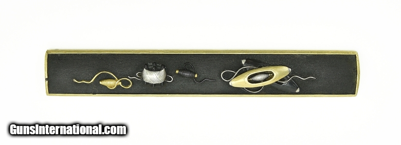 Description: "Kinko Kodzuka. Decorated with Spools of thread and Bobbins. Shakudo Nanako ground. Gold, silver, and Shakudo highlights. Signed: Goto Hojo. SOLD |