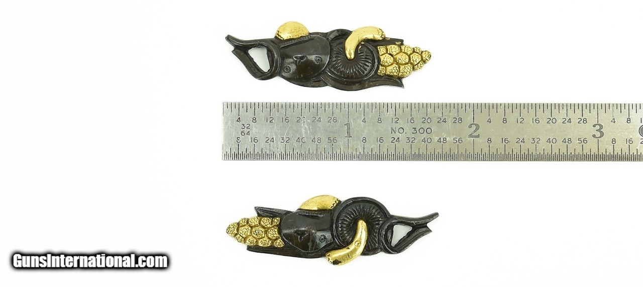 Description: "Kinko Menuki. Millet in gold and Shakudo. Katana sized in custom box. SOLD |