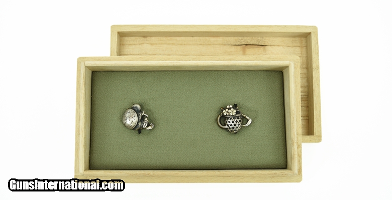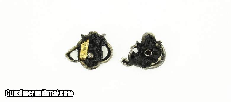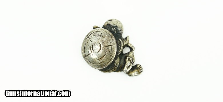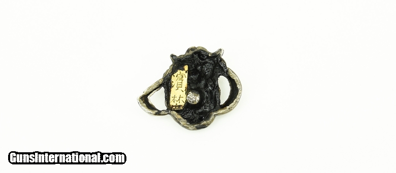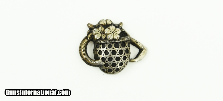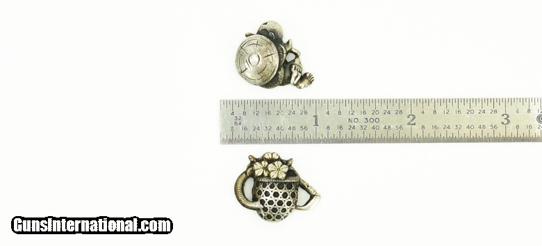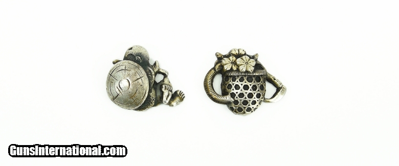 Description: "Kinko Menuki. Vase with Flowers. Figure with Jingasa. Solid silver. Signed. SOLD |