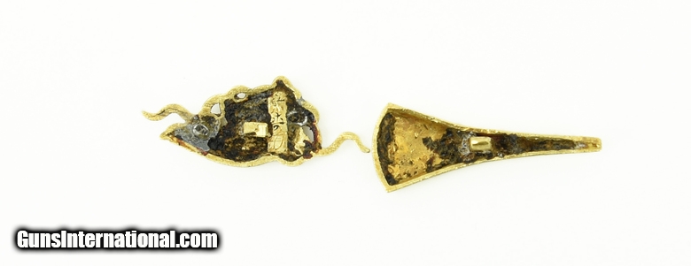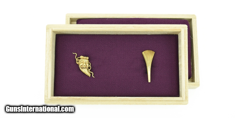 Description: "Kinko Menuki. Solid gold. Noh mask and fan. Tanto size. Very good quality. Unusual subject matter. SOLD |