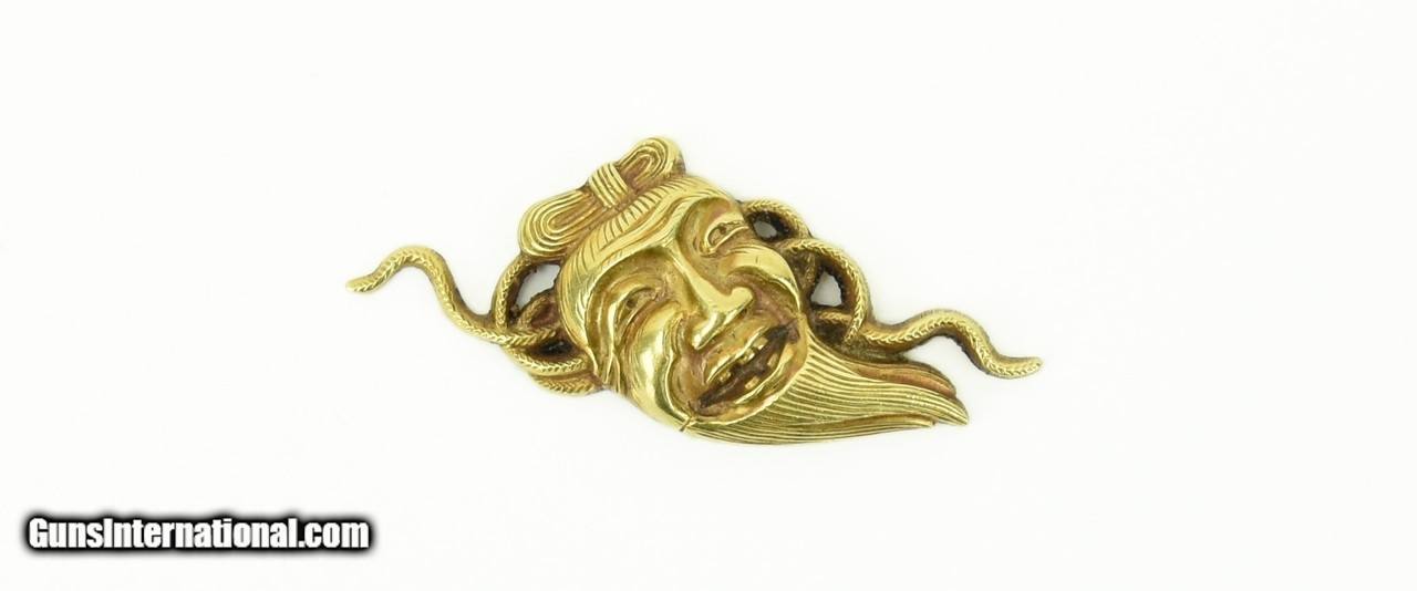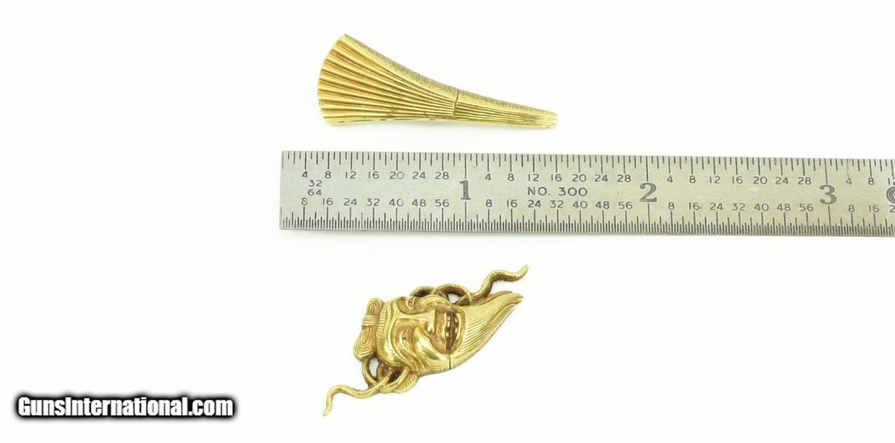 Description: "Kinko Menuki. Solid gold. Noh mask and fan. Tanto size. Very good quality. Unusual subject matter. SOLD |