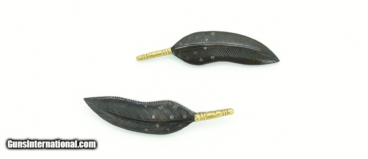 Description: "Kinko Menuki. Feather with gold and shakudo. Probably Goto School. Excellent condition. SOLD |