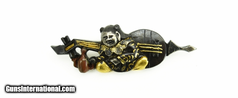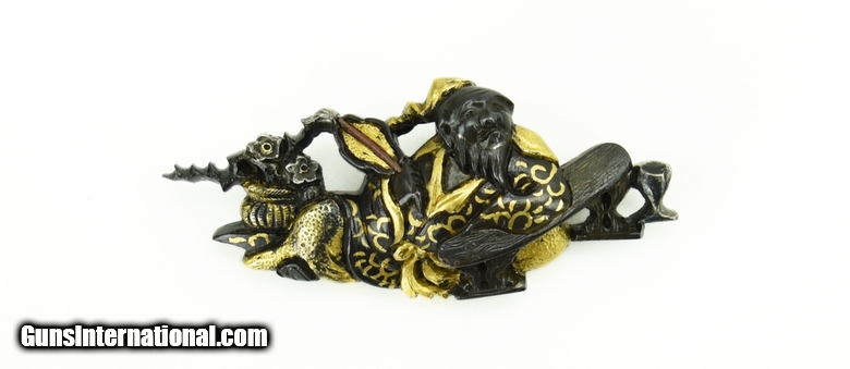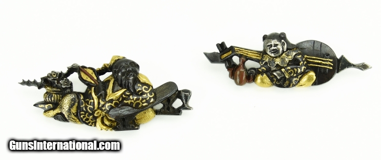 Description: "Kinko Menuki. Robed scholar with table and vase with flowers. Other Menuki has seated figure. SOLD |