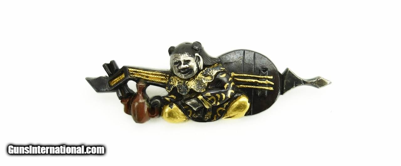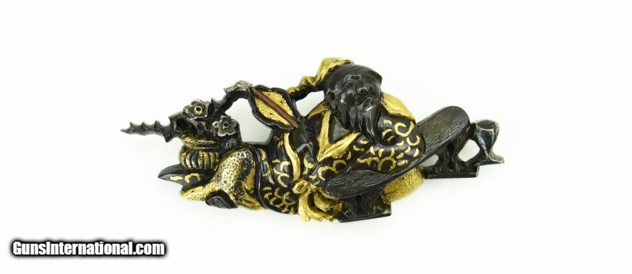 Description: "Kinko Menuki. Robed scholar with table and vase with flowers. Other Menuki has seated figure. Price: $495.00 Contact Seller |