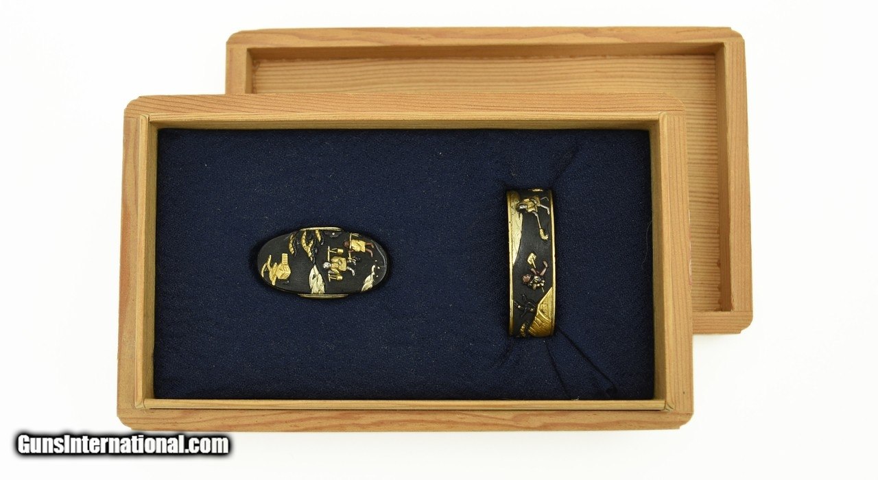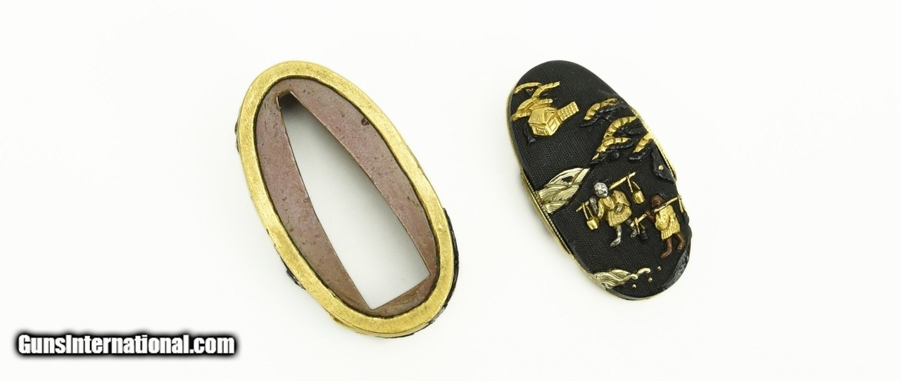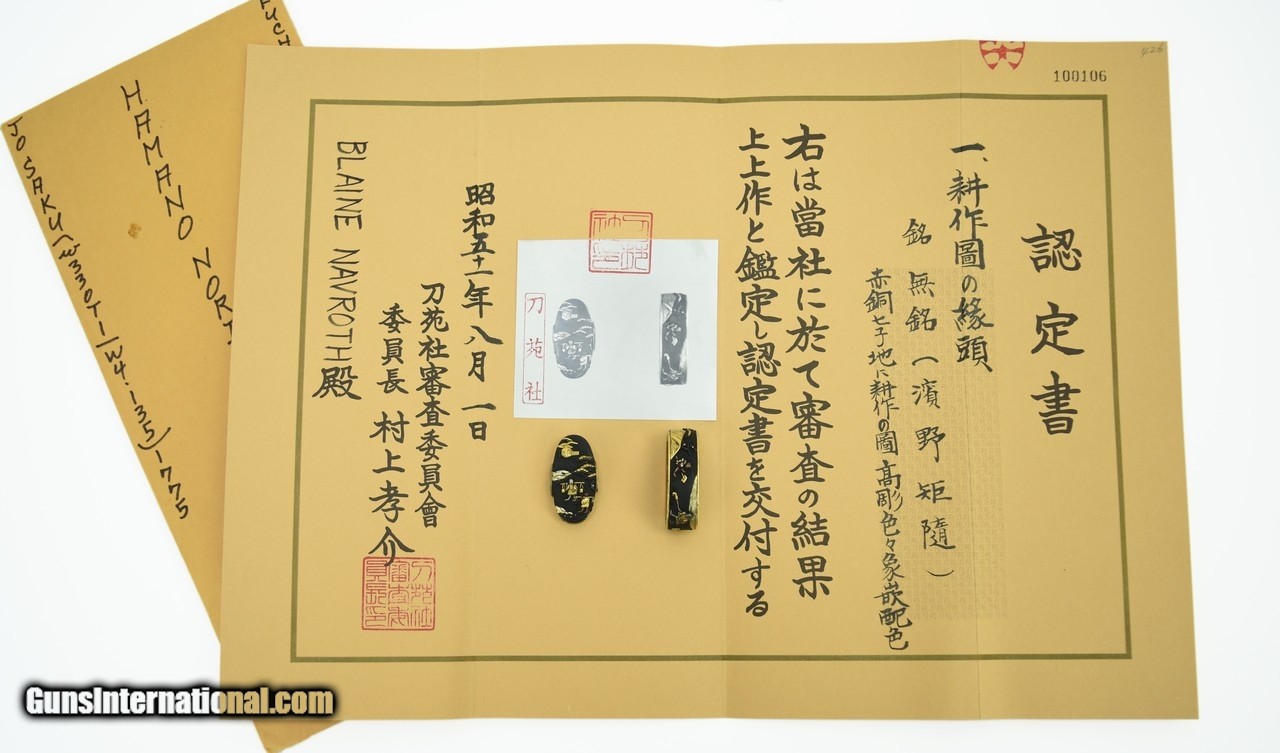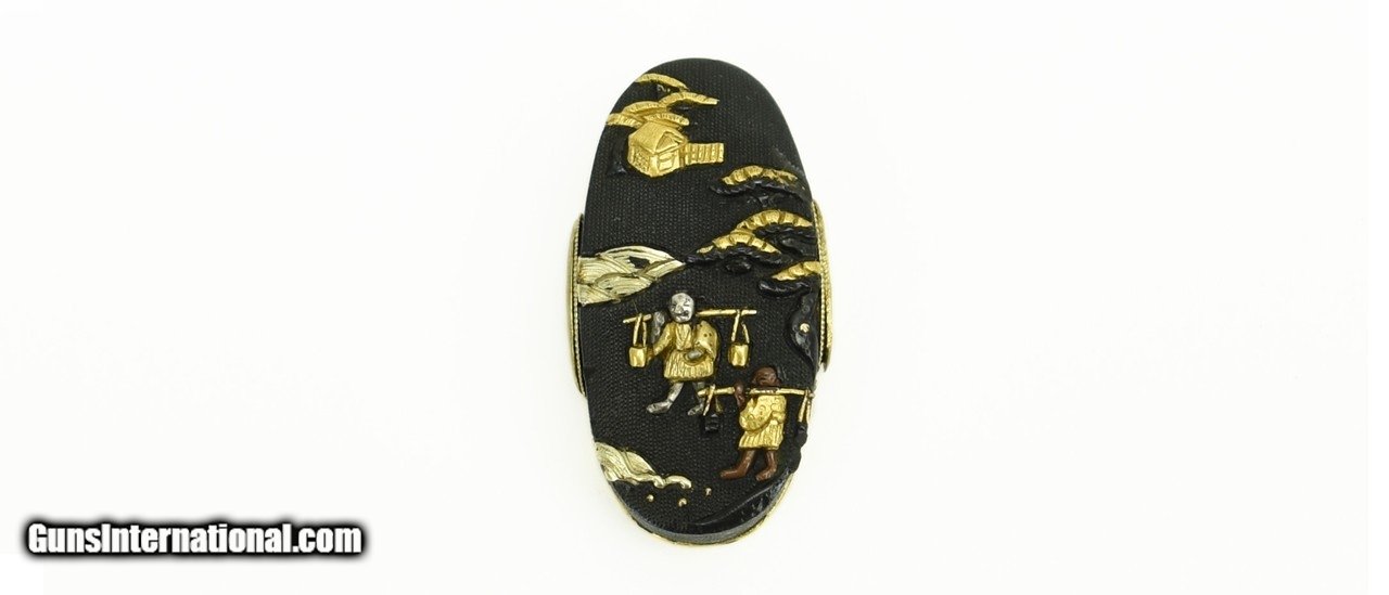 Description: "Kinko Menuki. Shakudo nanako ground. Motif is a rural scene with workers. Certificate issued by Toensha, attributing this set to Hamano Nori Yuki (1736-1787), pupil of Hamano Nasa Yuki. Baur, P.392. SOLD |