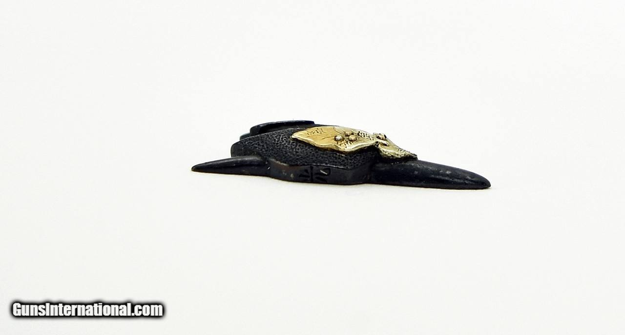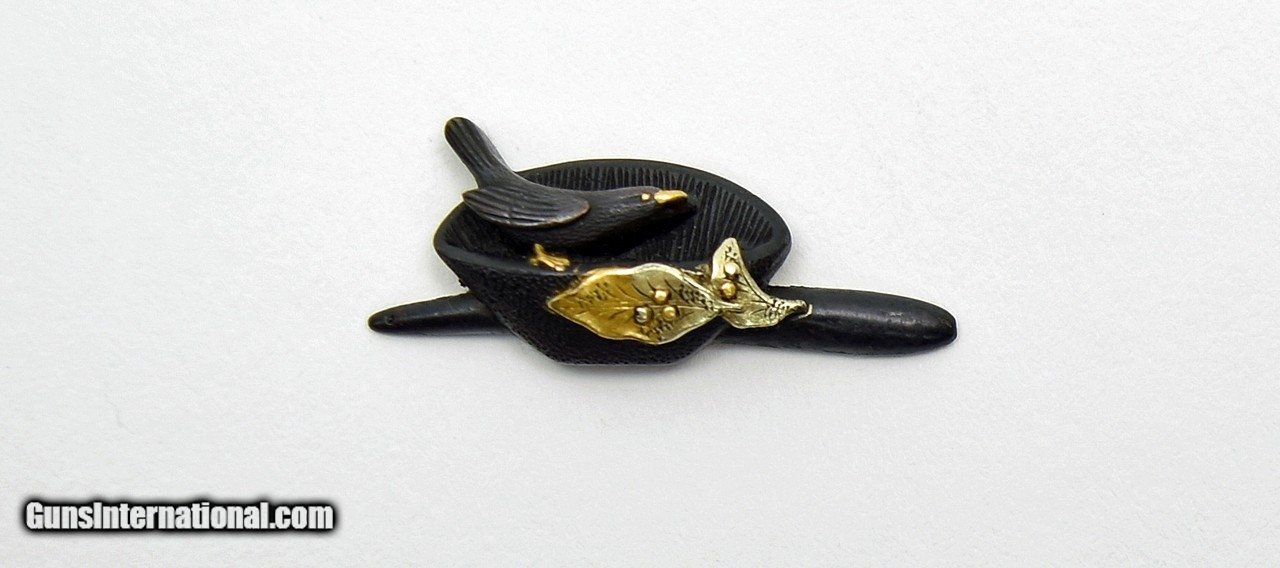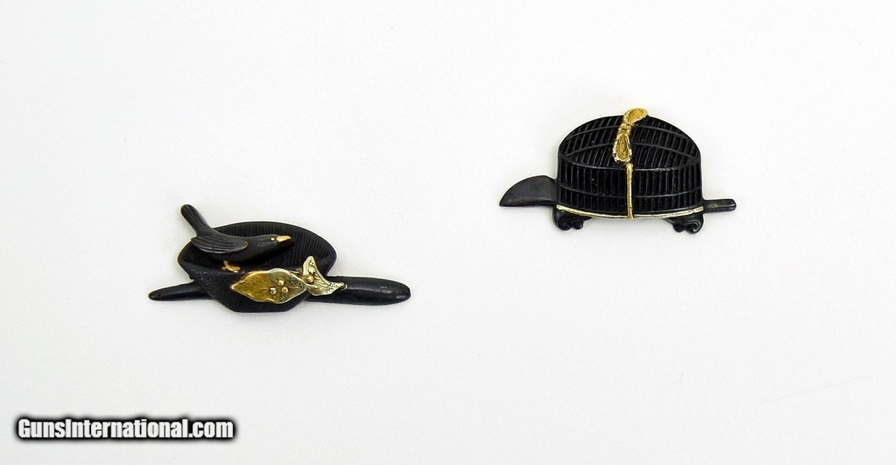 Description: "Kinko Menuki. Pair of signed menuki of shakudo and gold. Signed: Mitsu Masa 1759-1824. Bauer P. 386 (327). SOLD |