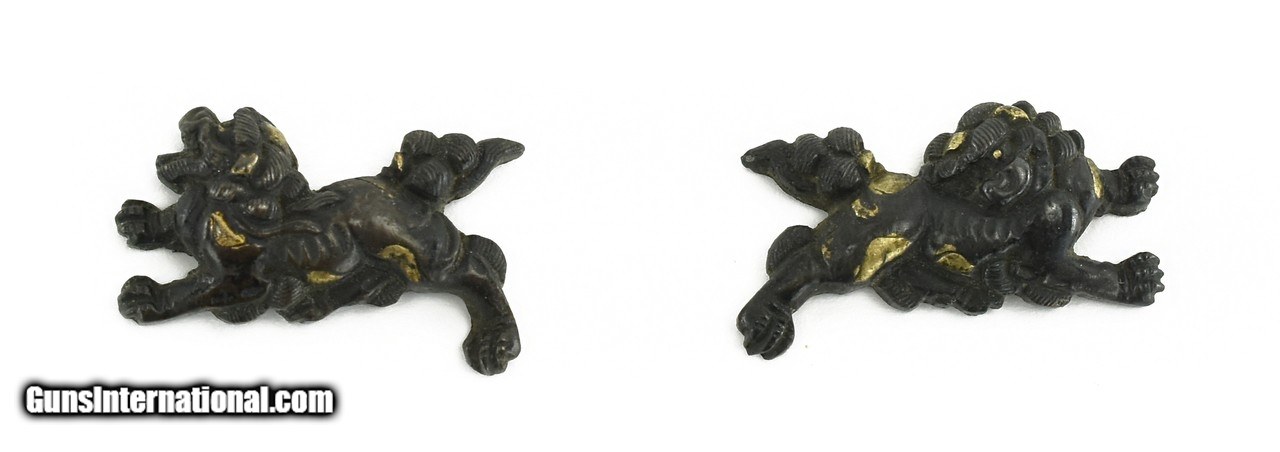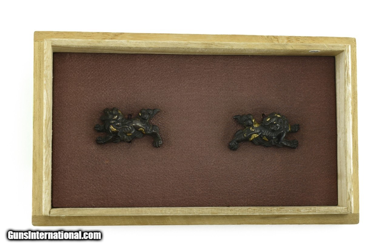 Description: "Kinko Menuki. Shakudo and gold Shi-Shi. Unsigned. Boxed. Price: $295.00 Contact Seller |