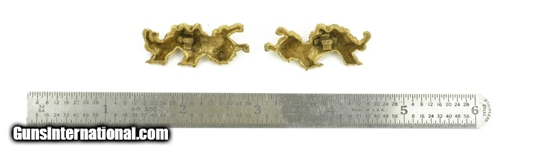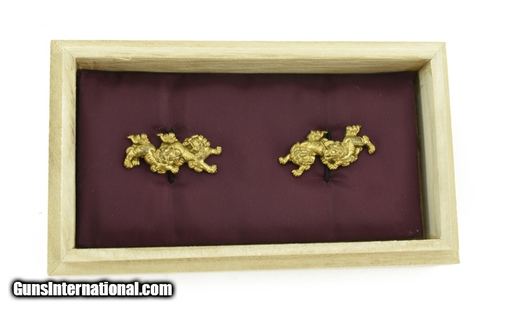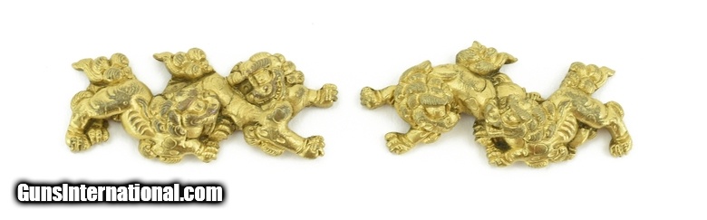 Description: "Kinko Menuki. Subject are Shi-Shi. Excellent carving and detail. Probably gold plate. SOLD |