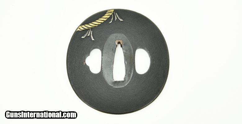 Description: "Kinko Tsuba. Shakudo Nanako ground. Scene depicts a groom with horse nuzzling him. The reverse with a gold rope bearing sacred paper slips in silver. Rim is lined in gold with cat-scratch pattern. An elegant Tsuba. Signed: Toshi-suke. SOLD |