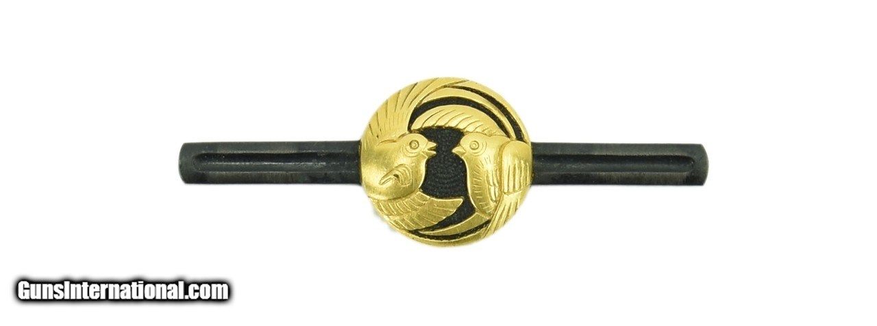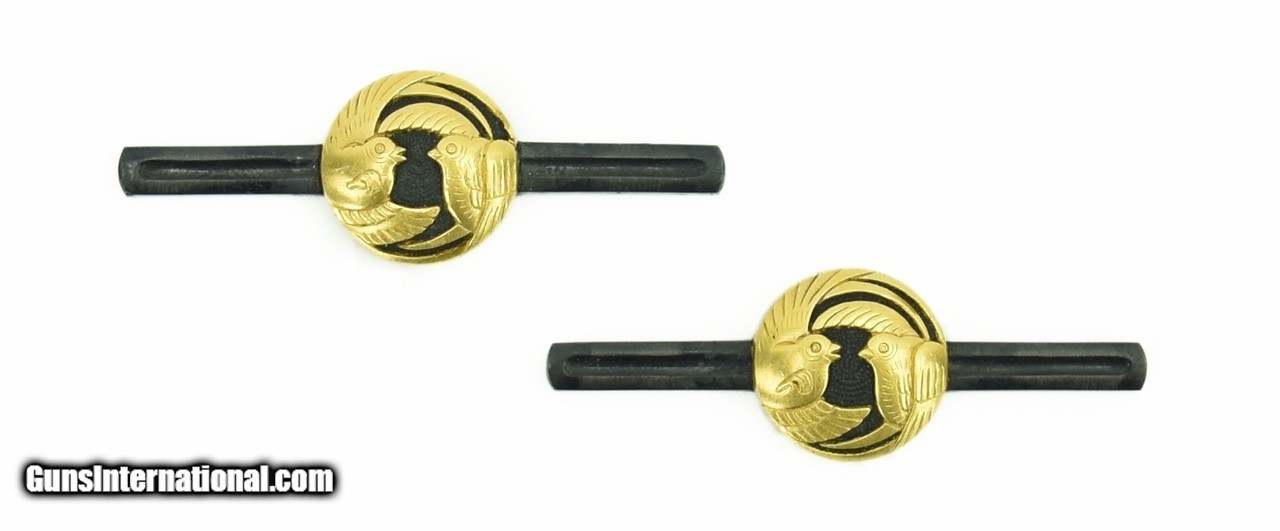 Description: "Pair of “bar" Menuki with 2 family crests of gold confronting sparrows on shakudo ground. SOLD |