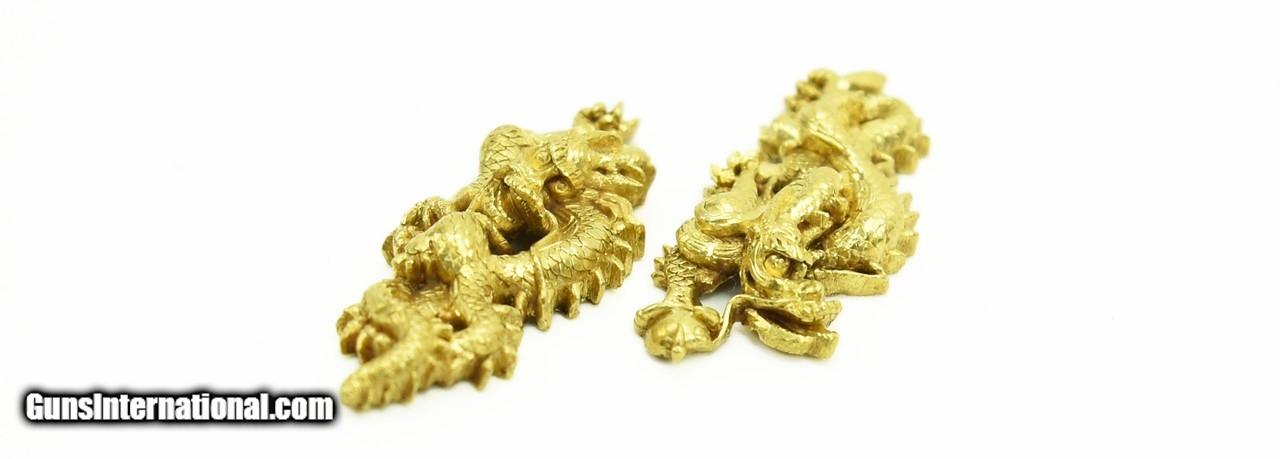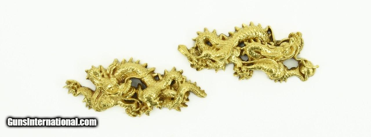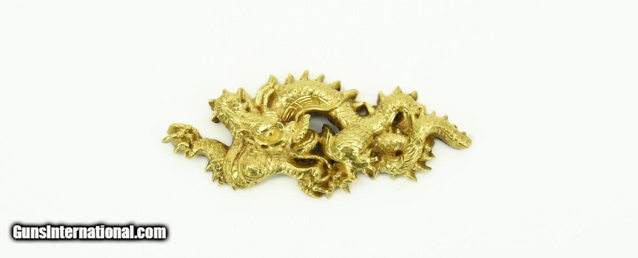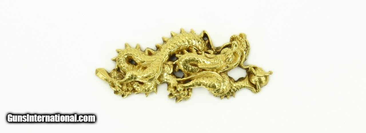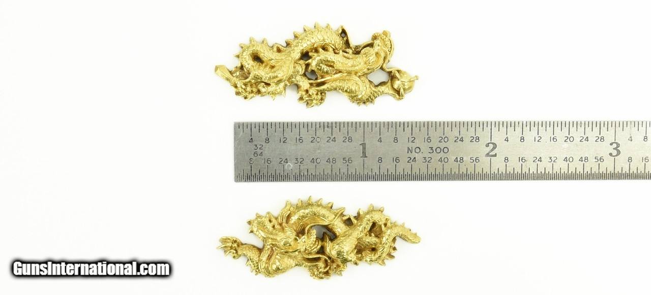 Description: "Pair of gold Menuki. Formed as a pair of sinuous dragons. 1 ½" (3.8cm) wide. SOLD |