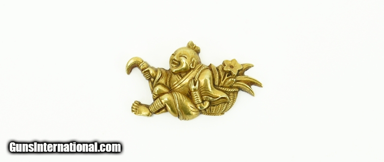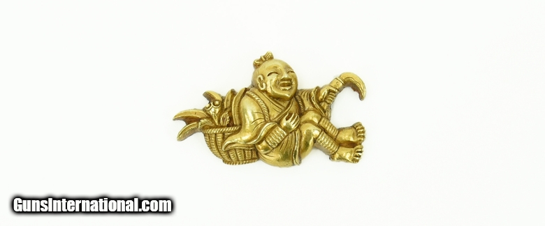 Description: "Pair of gold Menuki. Formed as a pair of seated farmers holding baskets and sickles. 1 ¼" (3.2cm) wide. SOLD |